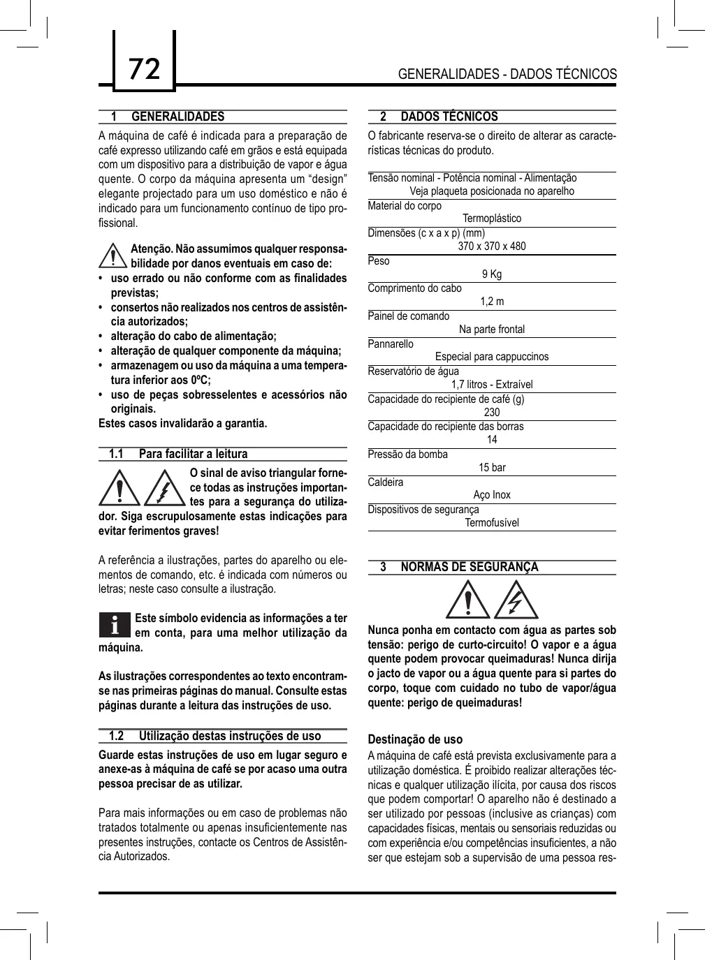 O fabricante reserva-se o direito de alterar as características técnicas do produto. Tensão nominal - Potência nominal - Alimentação Veja plaqueta posicionada no aparelho Material do corpo Termoplástico Dimensões (c x a x p) (mm) 370 x 370 x 480 Peso 9 Kg Comprimento do cabo 1,2 m Painel de comando Na parte frontal Pannarello Especial para cappuccinos Reservatório de água 1,7 litros - Extraível Capacidade do recipiente de café (g) Capacidade do recipiente das borras Pressão da bomba 15 bar Caldeira Aço Inox Dispositivos de segurança Termofusível