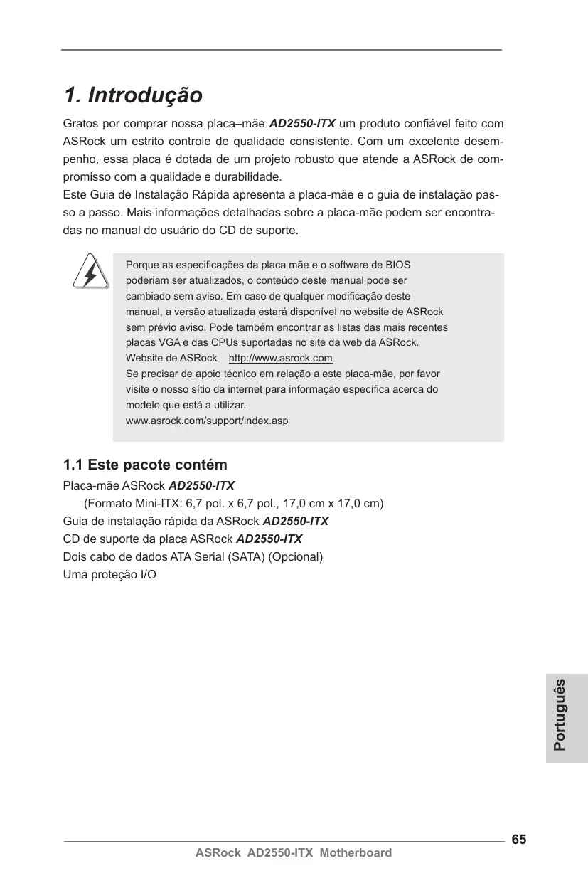 1. Introdução Gratos por comprar nossa placa–mãe AD2550-ITX um produto confiável feito com ASRock um estrito controle de qualidade consistente. Com um excelente desempenho, essa placa é dotada de um projeto robusto que atende a ASRock de compromisso com a qualidade e durabilidade. Este Guia de Instalação Rápida apresenta a placa-mãe e o guia de instalação passo a passo. Mais informações detalhadas sobre a placa-mãe podem ser encontradas no manual do usuário do CD de suporte. Porque as especificações da placa mãe e o software de BIOS poderiam ser atualizados, o conteúdo deste manual pode ser cambiado sem aviso. Em caso de qualquer modificação deste manual, a versão atualizada estará disponível no website de ASRock sem prévio aviso. Pode também encontrar as listas das mais recentes placas VGA e das CPUs suportadas no site da web da ASRock. Website de ASRock http://www.asrock.com Se precisar de apoio técnico em relação a este placa-mãe, por favor visite o nosso sítio da internet para informação específica acerca do modelo que está a utilizar. www.asrock.com/support/index.asp