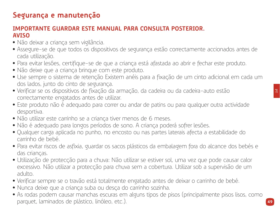 EN DE NL ES IT PT KO PL EL RU CS IMPORTANTE GUARDAR ESTE MANUAL PARA CONSULTA POSTERIOR. AVISO •• Não deixar a criança sem vigilância. •• Assegure-se de que todos os dispositivos de segurança estão correctamente accionados antes de cada utilização. •• Para evitar lesões, certifique-se de que a criança está afastada ao abrir e fechar este produto. •• Não deixe que a criança brinque com este produto. •• Use sempre o sistema de retenção Existem anéis para a fixação de um cinto adicional em cada um dos lados, junto do cinto de segurança. •• Verificar se os dispositivos de fixação da armação, da cadeira ou da cadeira-auto estão correctamente engatados antes de utilizar. •• Este produto não é adequado para correr ou andar de patins ou para qualquer outra actividade desportiva. •• Não utilizar este carrinho se a criança tiver menos de 6 meses. •• Não é adequado para longos períodos de sono. A criança poderá sofrer lesões. •• Qualquer carga aplicada no punho, no encosto ou nas partes laterais afecta a estabilidade do carrinho de bebé. •• Para evitar riscos de asfixia, guardar os sacos plásticos da embalagem fora do alcance dos bebés e das crianças. •• Utilização de protecção para a chuva: Não utilizar se estiver sol, uma vez que pode causar calor excessivo. Não utilizar a protecção para chuva sem a cobertura. Utilizar sob a supervisão de um adulto. •• Verificar sempre se o travão está totalmente engatado antes de deixar o carrinho de bebé. •• Nunca deixe que a criança suba ou desça do carrinho sozinha. •• As rodas podem causar manchas escuras em alguns tipos de pisos (principalmente pisos lisos, como parquet, laminados de plástico, linóleo, etc.).