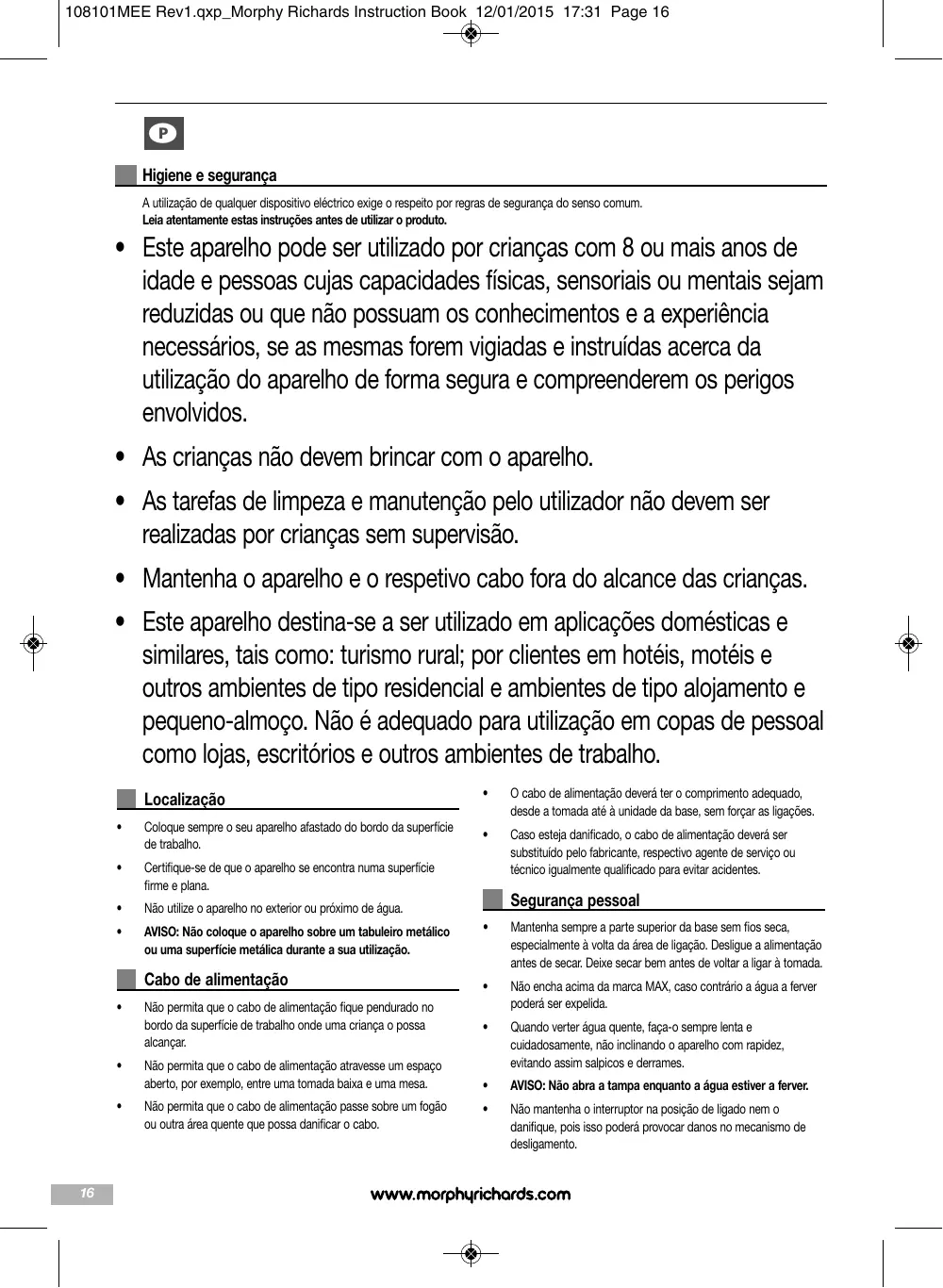 Encontre gratuitamente o manual do aparelho M108102EE MORPHY RICHARDS em formato PDF.
