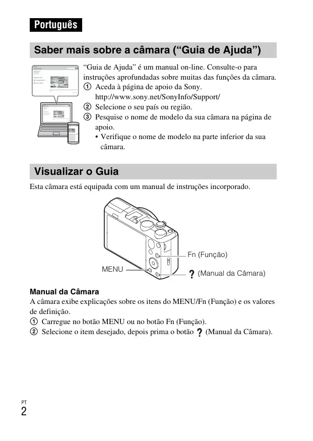 - Verifique o nome de modelo na parte inferior da sua câmara. Visualizar o Guia Esta câmara está equipada com um manual de instruções incorporado. Fn (Função) MENU (Manual da Câmara) Manual da Câmara A câmara exibe explicações sobre os itens do MENU/Fn (Função) e os valores de definição. 1 Carregue no botão MENU ou no botão Fn (Função). 2 Selecione o item desejado, depois prima o botão (Manual da Câmara).