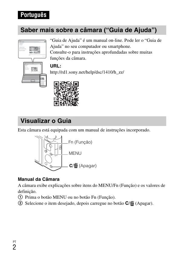 Português Saber mais sobre a câmara (“Guia de Ajuda”) “Guia de Ajuda” é um manual on-line. Pode ler o “Guia de Ajuda” no seu computador ou smartphone. Consulte-o para instruções aprofundadas sobre muitas funções da câmara. URL: http://rd1.sony.net/help/dsc/1410/h_zz/ Visualizar o Guia Esta câmara está equipada com um manual de instruções incorporado. Fn (Função) MENU
