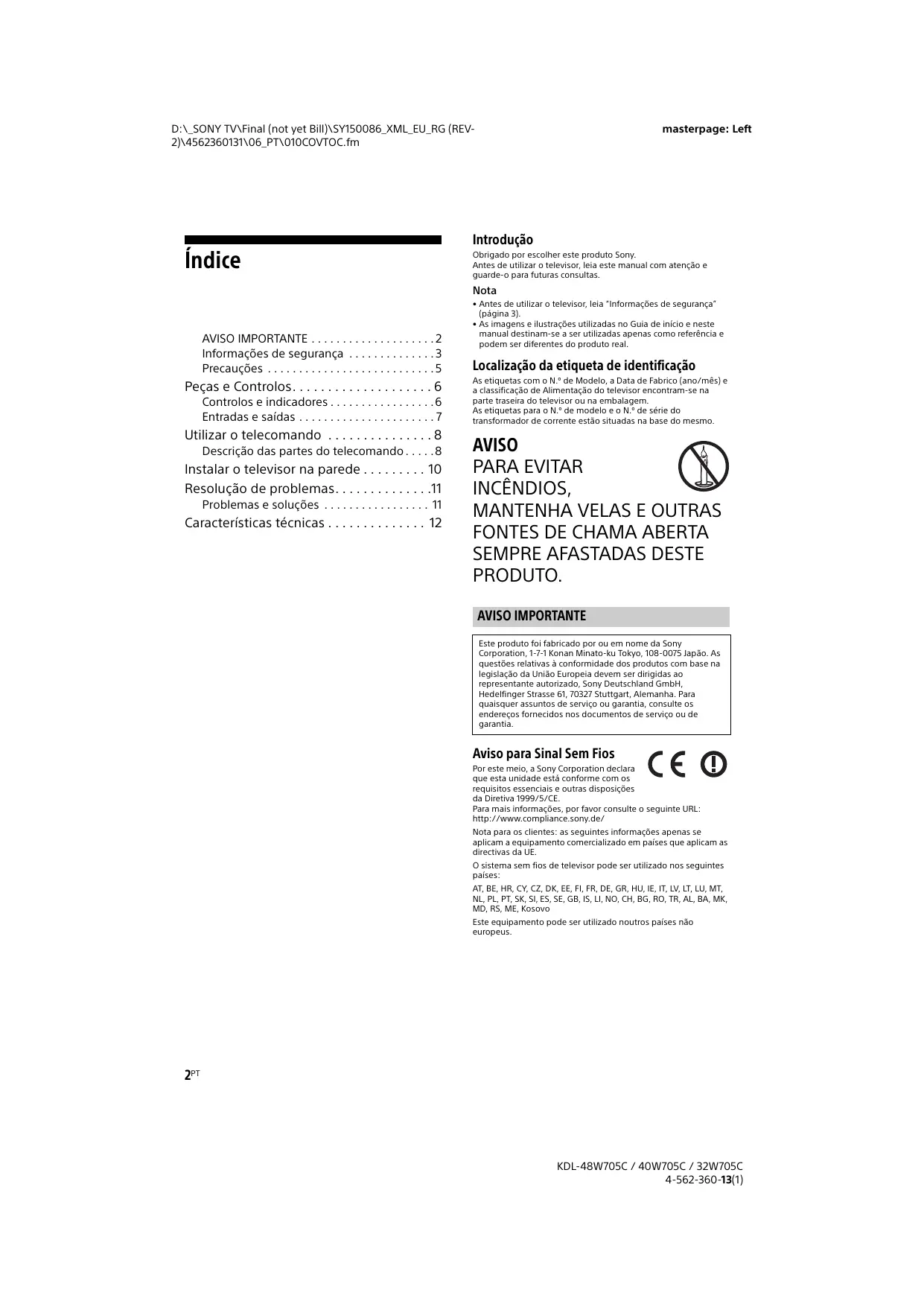 PRODUTO. AVISO IMPORTANTE Este produto foi fabricado por ou em nome da Sony Corporation, 1-7-1 Konan Minato-ku Tokyo, 108-0075 Japão. As questões relativas à conformidade dos produtos com base na legislação da União Europeia devem ser dirigidas ao representante autorizado, Sony Deutschland GmbH, Hedelfinger Strasse 61, 70327 Stuttgart, Alemanha. Para quaisquer assuntos de serviço ou garantia, consulte os endereços fornecidos nos documentos de serviço ou de garantia. Aviso para Sinal Sem Fios Por este meio, a Sony Corporation declara que esta unidade está conforme com os requisitos essenciais e outras disposições da Diretiva 1999/5/CE. Para mais informações, por favor consulte o seguinte URL: http://www.compliance.sony.de/ Nota para os clientes: as seguintes informações apenas se aplicam a equipamento comercializado em países que aplicam as directivas da UE. O sistema sem fios de televisor pode ser utilizado nos seguintes países: AT, BE, HR, CY, CZ, DK, EE, FI, FR, DE, GR, HU, IE, IT, LV, LT, LU, MT, NL, PL, PT, SK, SI, ES, SE, GB, IS, LI, NO, CH, BG, RO, TR, AL, BA, MK, MD, RS, ME, Kosovo Este equipamento pode ser utilizado noutros países não europeus. 2PT KDL-48W705C / 40W705C / 32W705C 4-562-360-13(1) D:\_SONY TV\Final (not yet Bill)\SY150086_XML_EU_RG (REV2)\4562360131\06_PT\010COVTOC.fm Informações de segurança ATENÇÃO As bateria não podem ser expostas a calor excessivo, como à luz do sol, perto do fogo ou situações semelhantes. Instalação/Programação Instale e utilize o televisor conforme as instruções abaixo para evitar todo o risco de incêndio, choque elétrico ou avaria e/ou feridas. masterpage: Right Ventilação