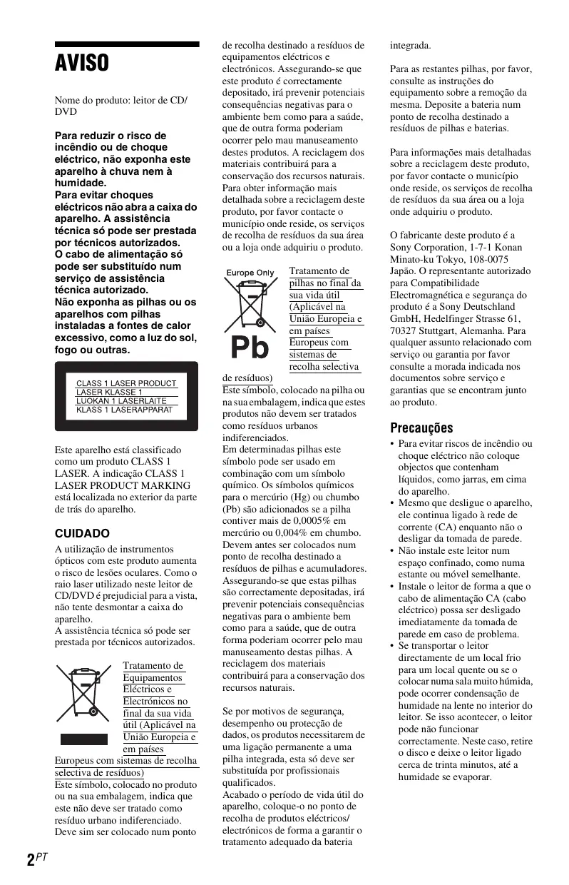 Para las demás baterías, consulte la sección donde se indica cómo extraer la batería del producto de forma segura. Deposite la batería en el correspondiente punto de recogida para el reciclado de baterías. Para recibir información detallada sobre el reciclaje de este producto o de la batería, póngase en contacto con el ayuntamiento, el punto de recogida más cercano o el establecimiento donde ha adquirido el producto. El fabricante de este producto es Sony Corporation, 1-7-1 Konan Minato-ku Tokyo, 108-0075 CA pueda ser desenchufado de la toma de corriente de la pared inmediatamente en caso de problema. • Si traslada el reproductor directamente de un lugar frío a uno cálido o si lo instala en una sala muy húmeda, es posible que se condense humedad en las lentes de su interior. Si esto ocurre, es posible que el reproductor no funcione correctamente. En este caso, extraiga el disco y deje encendido el reproductor durante