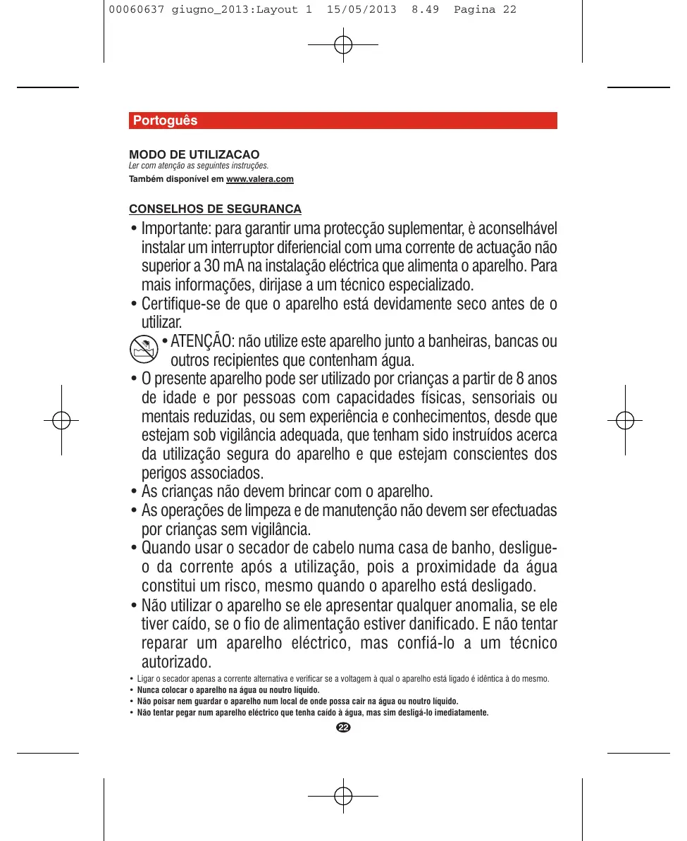 • Importante: para garantir uma protecção suplementar, è aconselhável instalar um interruptor diferiencial com uma corrente de actuação não superior a 30 mA na instalação eléctrica que alimenta o aparelho. Para mais informações, dirijase a um técnico especializado. • Certifique-se de que o aparelho está devidamente seco antes de o utilizar. •ATENÇÃO: não utilize este aparelho junto a banheiras, bancas ou outros recipientes que contenham água. • O presente aparelho pode ser utilizado por crianças a partir de 8 anos de idade e por pessoas com capacidades físicas, sensoriais ou mentais reduzidas, ou sem experiência e conhecimentos, desde que estejam sob vigilância adequada, que tenham sido instruídos acerca da utilização segura do aparelho e que estejam conscientes dos perigos associados. • As crianças não devem brincar com o aparelho. • As operações de limpeza e de manutenção não devem ser efectuadas por crianças sem vigilância. • Quando usar o secador de cabelo numa casa de banho, desligueo da corrente após a utilização, pois a proximidade da água constitui um risco, mesmo quando o aparelho está desligado. • Não utilizar o aparelho se ele apresentar qualquer anomalia, se ele tiver caído, se o fio de alimentação estiver danificado. E não tentar reparar um aparelho eléctrico, mas confiá-lo a um técnico autorizado. • • • •