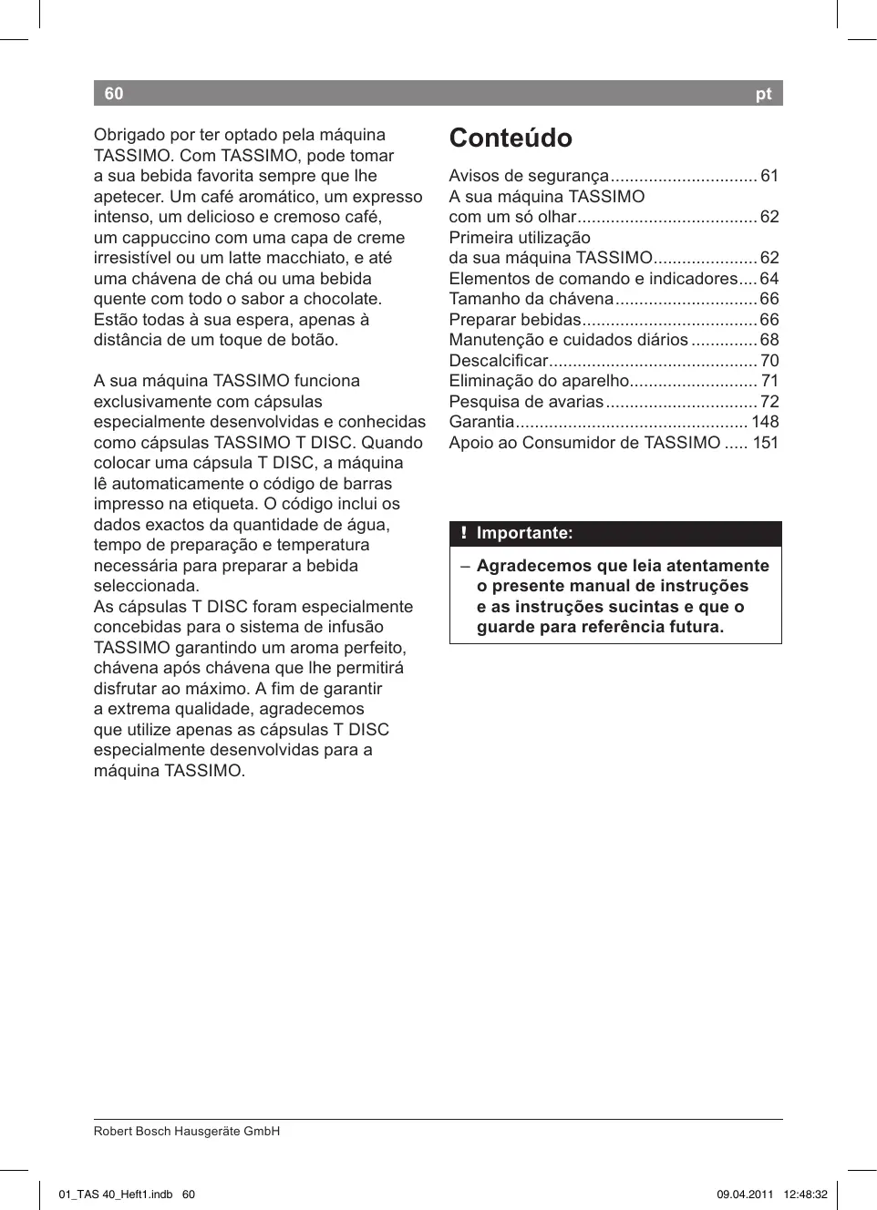 - Apoio ao Consumidor de TASSIMO !! Importante: –– Agradecemos que leia atentamente o presente manual de instruções e as instruções sucintas e que o guarde para referência futura. Robert Bosch Hausgeräte GmbH 01_TAS 40_Heft1.indb 60 p. 151