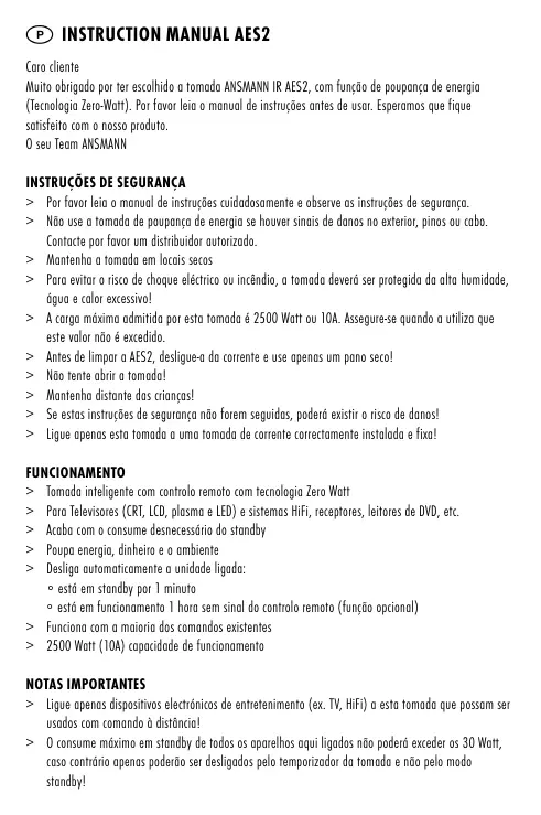 > Por favor leia o manual de instruções cuidadosamente e observe as instruções de segurança. > Não use a tomada de poupança de energia se houver sinais de danos no exterior, pinos ou cabo. Contacte por favor um distribuidor autorizado. > Mantenha a tomada em locais secos > Para evitar o risco de choque eléctrico ou incêndio, a tomada deverá ser protegida da alta humidade, água e calor excessivo! > A carga máxima admitida por esta tomada é 2500 Watt ou 10A. Assegure-se quando a utiliza que este valor não é excedido. > Antes de limpar a AES2, desligue-a da corrente e use apenas um pano seco! > Não tente abrir a tomada! > Mantenha distante das crianças! > Se estas instruções de segurança não forem seguidas, poderá existir o risco de danos! > Ligue apenas esta tomada a uma tomada de corrente correctamente instalada e fixa! FUNCIONAMENTO > Tomada inteligente com controlo remoto com tecnologia Zero Watt > Para Televisores (CRT, LCD, plasma e LED) e sistemas HiFi, receptores, leitores de DVD, etc. > Acaba com o consume desnecessário do standby > Poupa energia, dinheiro e o ambiente > Desliga automaticamente a unidade ligada: ∘ está em standby por 1 minuto ∘ está em funcionamento 1 hora sem sinal do controlo remoto (função opcional) > Funciona com a maioria dos comandos existentes > 2500 Watt (10A) capacidade de funcionamento NOTAS IMPORTANTES > Ligue apenas dispositivos electrónicos de entretenimento (ex. TV, HiFi) a esta tomada que possam ser usados com comando à distância! > O consume máximo em standby de todos os aparelhos aqui ligados não poderá exceder os 30 Watt, caso contrário apenas poderão ser desligados pelo temporizador da tomada e não pelo modo standby! > Vídeos, gravadores de DVD e outros dispositivos de gravação não deverão ser ligados a esta tomada, já que a alimentação será cortada na íntegra o que fará perder a programação do relógio dos mesmos! OPERACIONALIDADE