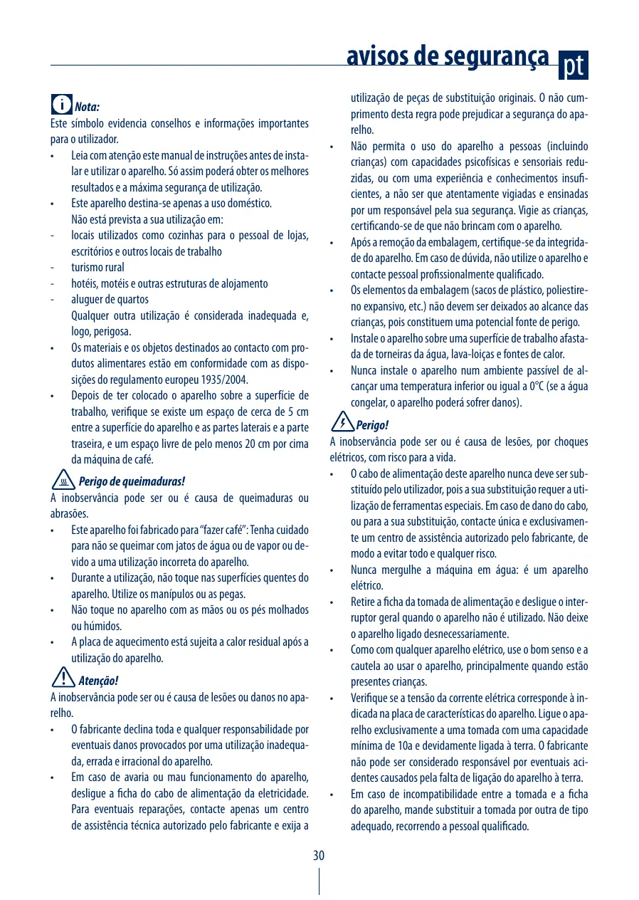 Le non-respect de ces recommandations peut entraîner un risque de brûlures. • Cet appareil est conçu pour faire du café: les projections d’eau et de vapeur ou une mauvaise utilisation de l’appareil peuvent provoquer des brûlures. • Pendant l’utilisation ne pas toucher les surfaces chaudes de l’appareil. Utiliser les poignées ou les manches. • Ne pas toucher l’appareil les mains ou les pieds mouillés ou humides. • La plaque chauffante reste chaude après l’utilisation de l’appareil. Attention! Le non-respect de ces recommandations peut entraîner des blessures ou des dommages à l’appareil. • Le fabricant ne peut être tenu pour responsable des dommages dus à une utilisation anormale, non conforme ou déraisonnable. • En cas de panne ou de mauvais fonctionnement éteignez l’appareil et débranchez la fiche de la prise. Pour toute réparation, adressez-vous exclusivement à un Centre de service agréé par le Fabricant et exigez des pièces détachées d’origine. Le non-respect de ces recommandations peut compromettre la sécurité de l’appareil.