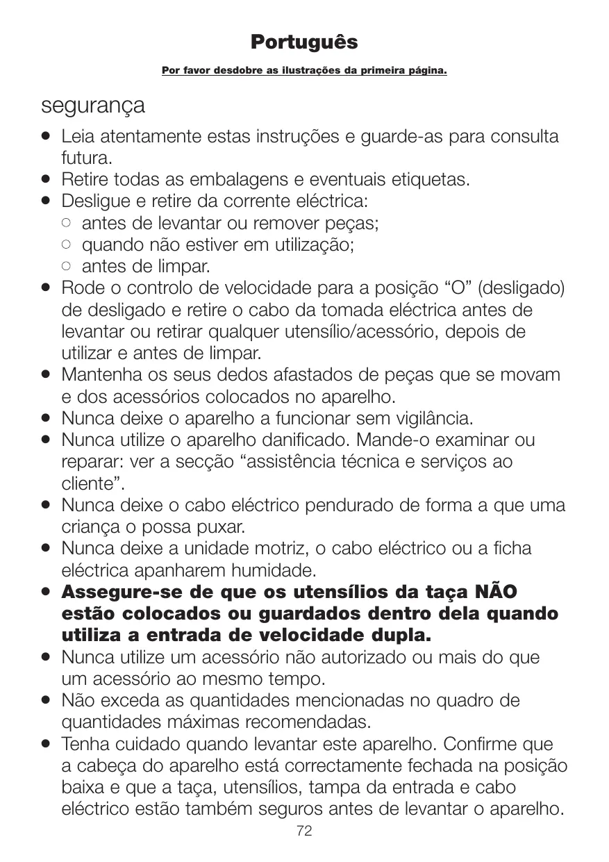 Leia atentamente estas instruções e guarde-as para consulta futura. Retire todas as embalagens e eventuais etiquetas. Desligue e retire da corrente eléctrica: l antes de levantar ou remover peças; l quando não estiver em utilização; l antes de limpar. Rode o controlo de velocidade para a posição “O” (desligado) de desligado e retire o cabo da tomada eléctrica antes de levantar ou retirar qualquer utensílio/acessório, depois de utilizar e antes de limpar. Mantenha os seus dedos afastados de peças que se movam e dos acessórios colocados no aparelho. Nunca deixe o aparelho a funcionar sem vigilância. Nunca utilize o aparelho danificado. Mande-o examinar ou reparar: ver a secção “assistência técnica e serviços ao cliente”. Nunca deixe o cabo eléctrico pendurado de forma a que uma criança o possa puxar. Nunca deixe a unidade motriz, o cabo eléctrico ou a ficha eléctrica apanharem humidade. Assegure-se de que os utensílios da taça NÃO estão colocados ou guardados dentro dela quando utiliza a entrada de velocidade dupla. Nunca utilize um acessório não autorizado ou mais do que um acessório ao mesmo tempo. Não exceda as quantidades mencionadas no quadro de quantidades máximas recomendadas. Tenha cuidado quando levantar este aparelho. Confirme que a cabeça do aparelho está correctamente fechada na posição baixa e que a taça, utensílios, tampa da entrada e cabo eléctrico estão também seguros antes de levantar o aparelho.