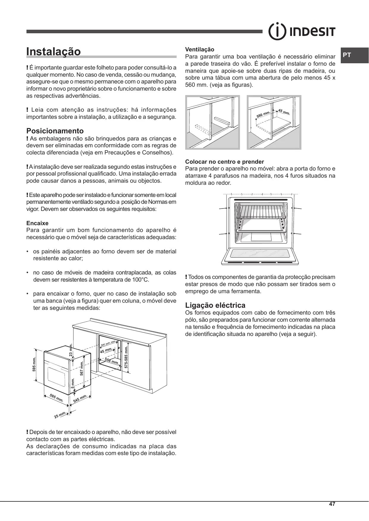 ! Este aparelho pode ser instalado e funcionar somente em local permanentemente ventilado segundo a posição de Normas em vigor. Devem ser observados os seguintes requisitos: Encaixe Para garantir um bom funcionamento do aparelho é necessário que o móvel seja de características adequadas: • os painéis adjacentes ao forno devem ser de material resistente ao calor; • no caso de móveis de madeira contraplacada, as colas devem ser resistentes à temperatura de 100°C. • para encaixar o forno, quer no caso de instalação sob uma banca (veja a figura) quer em coluna, o móvel deve ter as seguintes medidas:
