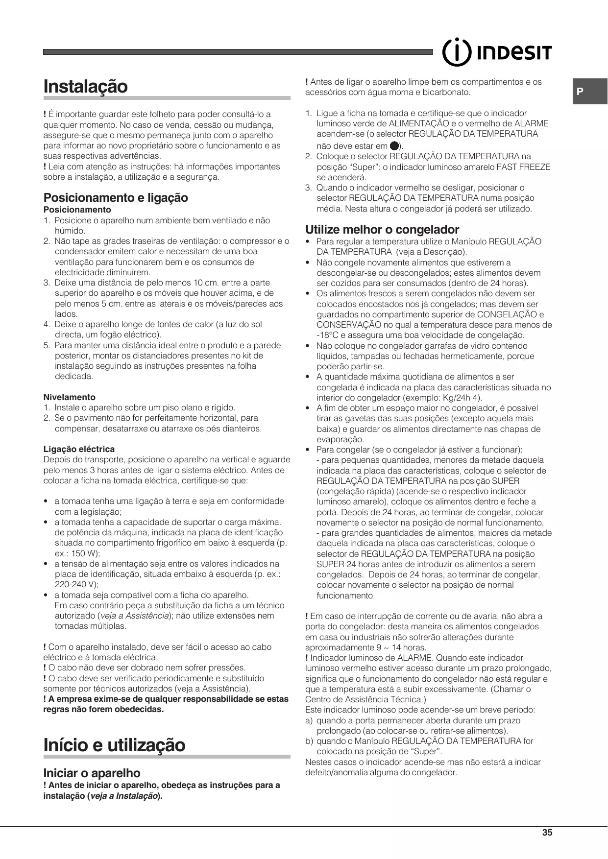 • Este aparelho foi concebido para uma utilização de tipo não profissional, no âmbito de uma morada. • Este aparelho deve ser utilizado somente por pessoas adultas, para conservar e congelar alimentos, segundo as instruções apresentadas neste folheto. • Este aparelho não deve ser instalado ao ar livre mesmo se num sítio abrigado, porque é muito perigoso deixá-lo exposto à chuva e temporais. • Não toque neste aparelho com os pés descalços nem com as mãos ou os pés molhados ou húmidos. • Não toque nas partes de refrigeração internas: há perigo de queimaduras e feridas. • Não puxe o cabo eléctrico para desligar a ficha da tomada, mas pegue pela ficha. • É necessário desligar a ficha da tomada antes de realizar operações de limpeza e manutenção. Não é suficiente colocar os selectores de regulação da temperatura na posição (aparelho desligado) para eliminar todos os contactos eléctricos. • No caso de avaria, nunca mexa nos mecanismos internos para tentar reparar. • Não utilize, no interior dos compartimentos para guardar alimentos congelados, utensílios cortantes e pontiagudos ou dispositivos eléctricos se não forem do tipo recomendado pelo construtor. • Não coloque na boca cubos de gelo assim que os retirar do congelador. • Não é previsto que este aparelho seja utilizado por pessoas (incluso crianças) com reduzidas capacidades físicas, sensoriais ou mentais, por pessoas inexperientes ou sem conhecimento, a não ser que sejam vigiadas ou que tenham recebido instruções preliminares sobre o uso do aparelho por parte de uma pessoa responsável pela sua segurança. As crianças deveriam ser vigiadas para evitar que brinquem com o aparelho. • Os embalagens não são brinquedos para as crianças.