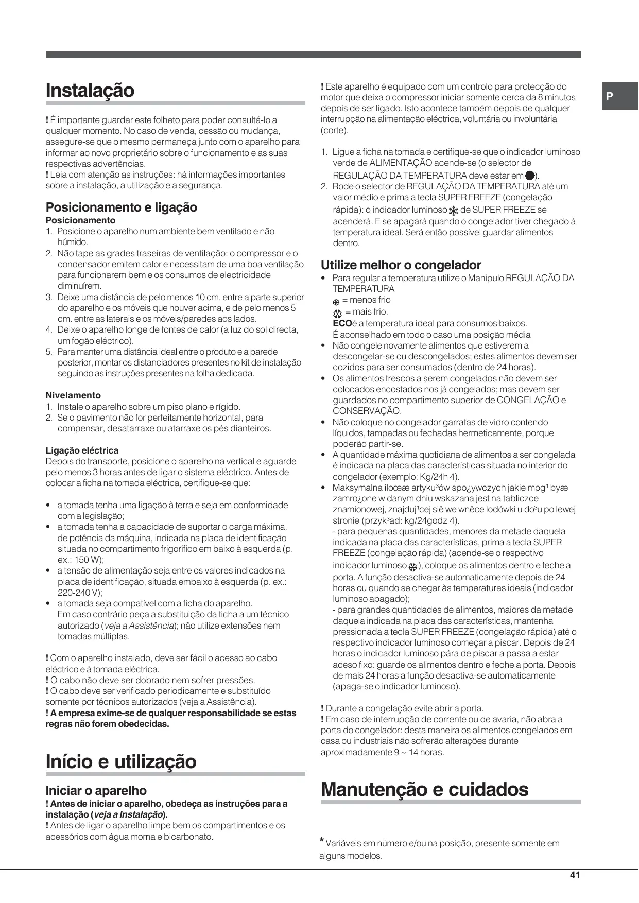 • el enchufe sea capaz de soportar la carga máxima de potencia de la máquina indicada en la placa de características ubicada en la parte inferior izquierda del frigorífico (ej. 150 W); • la tensión de alimentación esté comprendida entre los valores indicados en la placa de características ubicada abajo a la izquierda (ej. 220-240V); • la toma sea compatible con el enchufe del aparato. Si no fuera así, solicite la sustitución del enchufe a un técnico autorizado (ver Asistencia); no utilice prolongaciones ni conexiones múltiples. ! Una vez instalado el aparato, el cable eléctrico y la toma de corriente deben ser fácilmente accesibles. ! El cable no debe sufrir pliegues ni compresiones. (congelamiento rápido) (encendido de la correspondiente luz testigo ), introduzca los alimentos y cierre la puerta. La función se desactiva automáticamente después de 24 horas o cuando se alcanza la temperatura óptima (luz testigo apagada); - grandes cantidades, mayores que la mitad de la carga máxima indicada en la placa de características, mantenga presionado el botón SUPER FREEZE (congelamiento rápido) hasta que la luz testigo correspondiente comience a centellear. Después de 24 horas la luz testigo deja de centellear y se mantiene fija: introduzca los alimentos y cierre la puerta. Pasadas otras 24 horas, la función se desactivará automáticamente (luz testigo apagada). ! Durante el congelamiento evite abrir la puerta. ! Cuando se produzca una interrupción de corriente o una avería, no abra la puerta del congelador: de este modo, los alimentos congelados se conservarán sin alteración durante aproximadamente 9-14 horas.