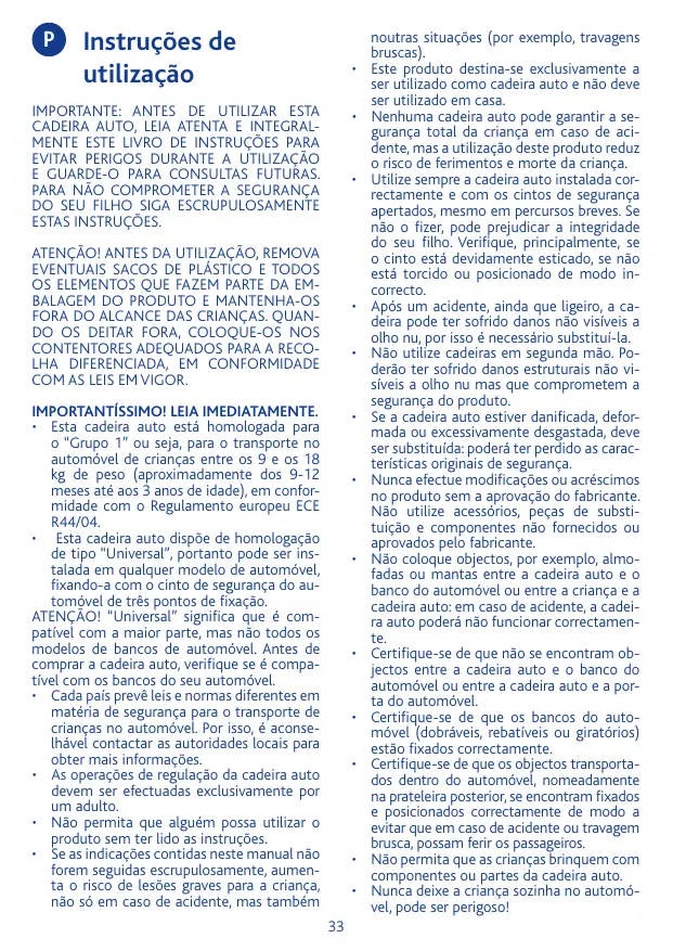 • No permita que nadie utilice el producto sin haber leído las instrucciones. • Si no se siguen exactamente las instrucciones de este manual aumenta el riesgo de daños graves para el niño, no sólo en caso de accidente sino también en otras situaciones (por ej. frenadas bruscas, etc.). • Este producto debe ser utilizado exclusivamente como sillita de automóvil; no utili28