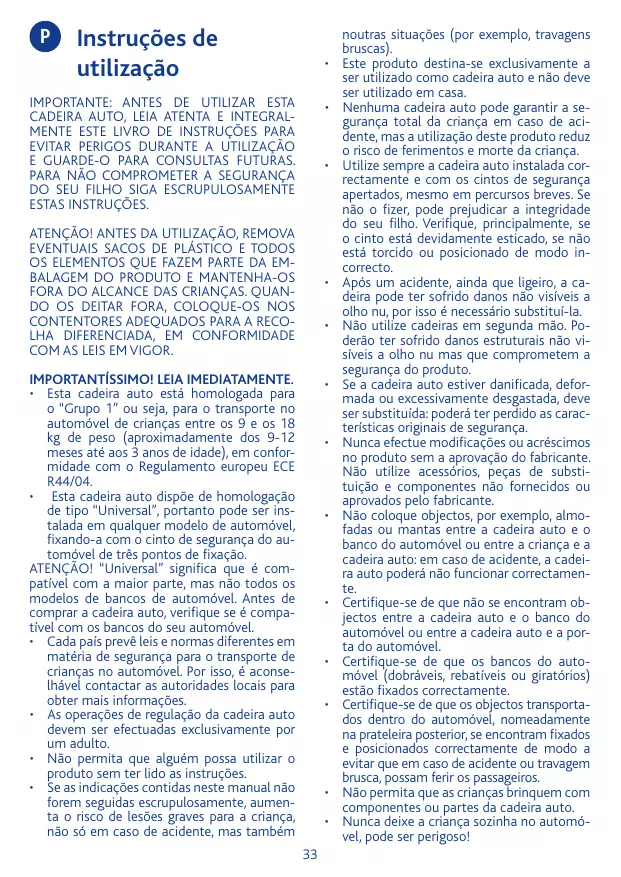 IMPORTANTÍSSIMO! LEIA IMEDIATAMENTE. • Esta cadeira auto está homologada para o “Grupo 1” ou seja, para o transporte no automóvel de crianças entre os 9 e os 18 kg de peso (aproximadamente dos 9-12 meses até aos 3 anos de idade), em conformidade com o Regulamento europeu ECE R44/04. • Esta cadeira auto dispõe de homologação de tipo “Universal”, portanto pode ser instalada em qualquer modelo de automóvel, fixando-a com o cinto de segurança do automóvel de três pontos de fixação. ATENÇÃO! “Universal” significa que é compatível com a maior parte, mas não todos os modelos de bancos de automóvel. Antes de comprar a cadeira auto, verifique se é compatível com os bancos do seu automóvel. • Cada país prevê leis e normas diferentes em matéria de segurança para o transporte de crianças no automóvel. Por isso, é aconselhável contactar as autoridades locais para obter mais informações. • As operações de regulação da cadeira auto devem ser efectuadas exclusivamente por um adulto. • Não permita que alguém possa utilizar o produto sem ter lido as instruções. • Se as indicações contidas neste manual não forem seguidas escrupulosamente, aumenta o risco de lesões graves para a criança, não só em caso de acidente, mas também
