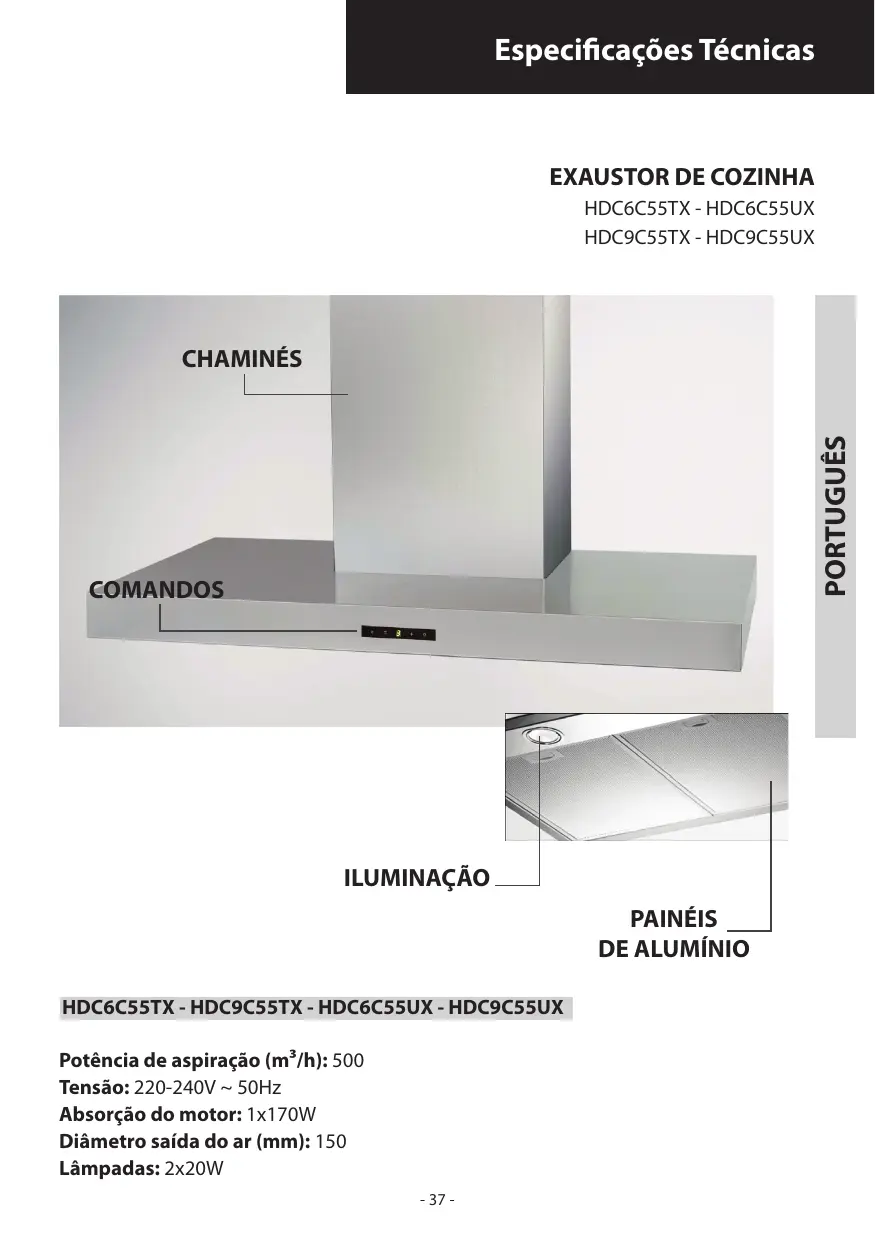 HDC6C55TX - HDC9C55TX - HDC6C55UX - HDC9C55UX Potência de aspiração (m³/h): 500 Tensão: 220-240V ~ 50Hz Absorção do motor: 1x170W Diâmetro saída do ar (mm): 150 Lâmpadas: 2x20W