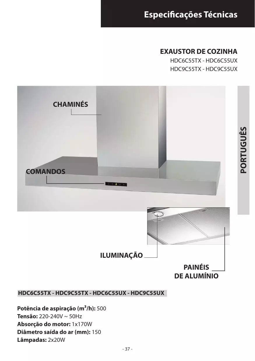 EXAUSTOR DE COZINHA HDC6C55TX - HDC6C55UX HDC9C55TX - HDC9C55UX PORTUGUÊS CHAMINÉS COMANDOS ILUMINAÇÃO PAINÉIS DE ALUMÍNIO HDC6C55TX - HDC9C55TX - HDC6C55UX - HDC9C55UX Potência de aspiração (m³/h): 500 Tensão: 220-240V ~ 50Hz Absorção do motor: 1x170W Diâmetro saída do ar (mm): 150 Lâmpadas: 2x20W - 37 -