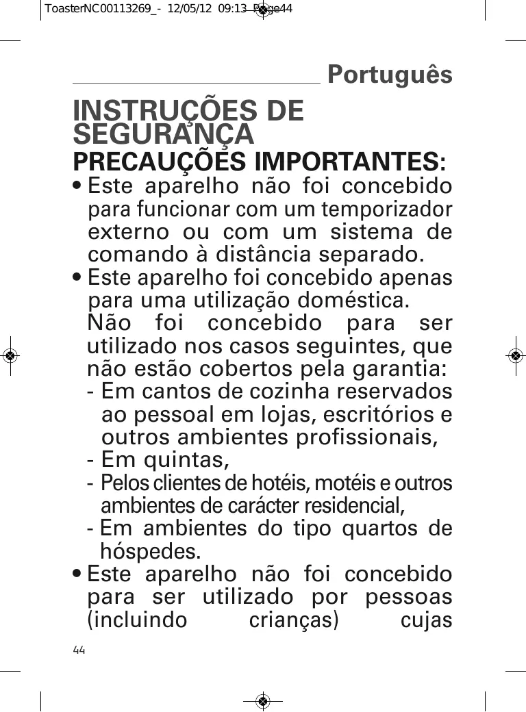 ToasterNC00113269_- 12/05/12 09:13 Page45 capacidades físicas, sensoriais ou mentais se encontram reduzidas, ou por pessoas com falta de experiência ou conhecimento, a não ser que tenham sido devidamente acompanhadas e instruídas sobre a correcta utilização do aparelho, pela pessoa responsável pela sua segurança.