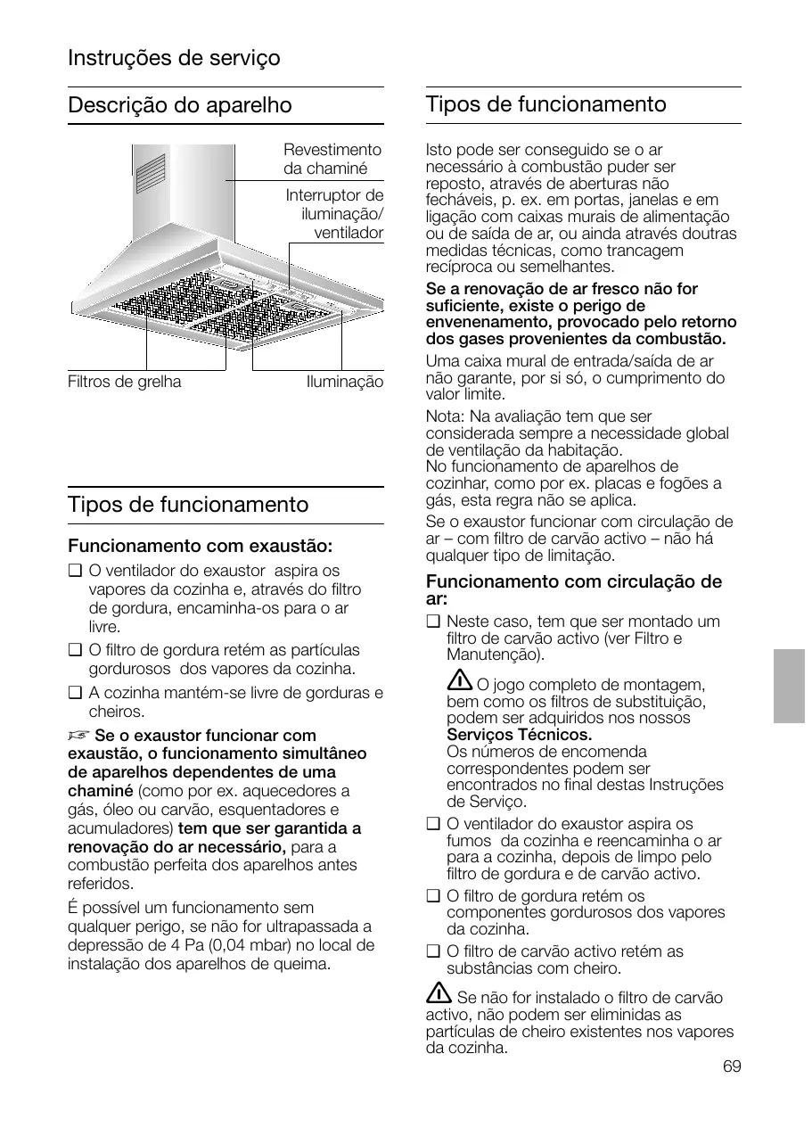 Instruções de serviço Tipos de funcionamento Descrição do aparelho Revestimento da chaminé Interruptor de iluminação/ ventilador Filtros de grelha Iluminação Tipos de funcionamento Funcionamento com exaustão: ❑ O ventilador do exaustor aspira os vapores da cozinha e, através do filtro de gordura, encaminha-os para o ar livre. ❑ O filtro de gordura retém as partículas gordurosos dos vapores da cozinha. ❑ A cozinha mantém-se livre de gorduras e cheiros. D Se o exaustor funcionar com exaustão, o funcionamento simultâneo de aparelhos dependentes de uma chaminé (como por ex. aquecedores a gás, óleo ou carvão, esquentadores e acumuladores) tem que ser garantida a renovação do ar necessário, para a combustão perfeita dos aparelhos antes referidos. É possível um funcionamento sem qualquer perigo, se não for ultrapassada a depressão de 4 Pa (0,04 mbar) no local de instalação dos aparelhos de queima. Isto pode ser conseguido se o ar necessário à combustão puder ser reposto, através de aberturas não fecháveis, p. ex. em portas, janelas e em ligação com caixas murais de alimentação ou de saída de ar, ou ainda através doutras medidas técnicas, como trancagem recíproca ou semelhantes. Se a renovação de ar fresco não for suficiente, existe o perigo de envenenamento, provocado pelo retorno dos gases provenientes da combustão. Uma caixa mural de entrada/saída de ar não garante, por si só, o cumprimento do valor limite. Nota: Na avaliação tem que ser considerada sempre a necessidade global de ventilação da habitação. No funcionamento de aparelhos de cozinhar, como por ex. placas e fogões a gás, esta regra não se aplica. Se o exaustor funcionar com circulação de ar – com filtro de carvão activo – não há qualquer tipo de limitação. Funcionamento com circulação de ar: ❑ Neste caso, tem que ser montado um filtro de carvão activo (ver Filtro e Manutenção). O jogo completo de montagem, bem como os filtros de substituição, podem ser adquiridos nos nossos Serviços Técnicos. Os números de encomenda correspondentes podem ser encontrados no final destas Instruções de Serviço. ❑ O ventilador do exaustor aspira os fumos da cozinha e reencaminha o ar para a cozinha, depois de limpo pelo filtro de gordura e de carvão activo. ❑ O filtro de gordura retém os componentes gordurosos dos vapores da cozinha. ❑ O filtro de carvão activo retém as substâncias com cheiro.