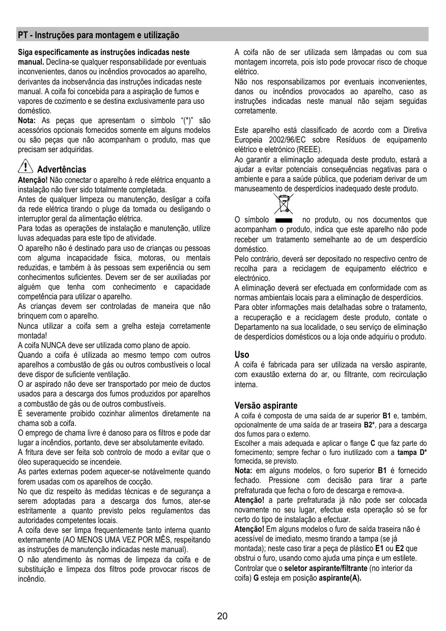 PT - Instruções para montagem e utilização Siga especificamente as instruções indicadas neste manual. Declina-se qualquer responsabilidade por eventuais inconvenientes, danos ou incêndios provocados ao aparelho, derivantes da inobservância das instruções indicadas neste manual. A coifa foi concebida para a aspiração de fumos e vapores de cozimento e se destina exclusivamente para uso doméstico. Nota: As peças que apresentam o símbolo “(*)” são acessórios opcionais fornecidos somente em alguns modelos ou são peças que não acompanham o produto, mas que precisam ser adquiridas. A coifa não de ser utilizada sem lâmpadas ou com sua montagem incorreta, pois isto pode provocar risco de choque elétrico. Não nos responsabilizamos por eventuais inconvenientes, danos ou incêndios provocados ao aparelho, caso as instruções indicadas neste manual não sejam seguidas corretamente. Este aparelho está classificado de acordo com a Diretiva Europeia 2002/96/EC sobre Resíduos de equipamento elétrico e eletrónico (REEE). Ao garantir a eliminação adequada deste produto, estará a ajudar a evitar potenciais consequências negativas para o ambiente e para a saúde pública, que poderiam derivar de um manuseamento de desperdícios inadequado deste produto. Advertências Atenção! Não conectar o aparelho à rede elétrica enquanto a instalação não tiver sido totalmente completada. Antes de qualquer limpeza ou manutenção, desligar a coifa da rede elétrica tirando o pluge da tomada ou desligando o interruptor geral da alimentação elétrica. Para todas as operações de instalação e manutenção, utilize luvas adequadas para este tipo de atividade. O aparelho não é destinado para uso de crianças ou pessoas com alguma incapacidade fisica, motoras, ou mentais reduzidas, e também à às pessoas sem experiência ou sem conhecimentos suficientes. Devem ser de ser auxiliadas por alguém que tenha com conhecimento e capacidade competência para utilizar o aparelho. As crianças devem ser controladas de maneira que não brinquem com o aparelho. Nunca utilizar a coifa sem a grelha esteja corretamente montada! A coifa NUNCA deve ser utilizada como plano de apoio. Quando a coifa é utilizada ao mesmo tempo com outros aparelhos a combustão de gás ou outros combustíveis o local deve dispor de suficiente ventilação. O ar aspirado não deve ser transportado por meio de ductos usados para a descarga dos fumos produzidos por aparelhos a combustão de gás ou de outros combustíveis. É severamente proibido cozinhar alimentos diretamente na chama sob a coifa. O emprego de chama livre é danoso para os filtros e pode dar lugar a incêndios, portanto, deve ser absolutamente evitado. A fritura deve ser feita sob controlo de modo a evitar que o óleo superaquecido se incendeie. As partes externas podem aquecer-se notávelmente quando forem usadas com os aparelhos de cocção. No que diz respeito às medidas técnicas e de segurança a serem adoptadas para a descarga dos fumos, ater-se estritamente a quanto previsto pelos regulamentos das autoridades competentes locais. A coifa deve ser limpa frequentemente tanto interna quanto externamente (AO MENOS UMA VEZ POR MÊS, respeitando as instruções de manutenção indicadas neste manual). O não atendimento às normas de limpeza da coifa e de substituição e limpeza dos filtros pode provocar riscos de incêndio. no produto, ou nos documentos que O símbolo acompanham o produto, indica que este aparelho não pode receber um tratamento semelhante ao de um desperdício doméstico. Pelo contrário, deverá ser depositado no respectivo centro de recolha para a reciclagem de equipamento eléctrico e electrónico. A eliminação deverá ser efectuada em conformidade com as normas ambientais locais para a eliminação de desperdícios. Para obter informações mais detalhadas sobre o tratamento, a recuperação e a reciclagem deste produto, contate o Departamento na sua localidade, o seu serviço de eliminação de desperdícios domésticos ou a loja onde adquiriu o produto. Uso A coifa é fabricada para ser utilizada na versão aspirante, com exaustão externa do ar, ou filtrante, com recirculação interna. Versão aspirante A coifa é composta de uma saída de ar superior B1 e, também, opcionalmente de uma saída de ar traseira B2*, para a descarga dos fumos para o externo. Escolher a mais adequada e aplicar o flange C que faz parte do fornecimento; sempre fechar o furo inutilizado com a tampa D* fornecida, se previsto. Nota: em alguns modelos, o foro superior B1 é fornecido fechado. Pressione com decisão para tirar a parte prefraturada que fecha o foro de descarga e remova-a. Atenção! a parte prefraturada já não pode ser colocada novamente no seu lugar, efectue esta operação só se for certo do tipo de instalação a efectuar. Atenção! Em alguns modelos o furo de saída traseira não é acessível de imediato, mesmo tirando a tampa (se já montada); neste caso tirar a peça de plástico E1 ou E2 que obstrui o furo, usando como ajuda uma pinça e um estilete. Controlar que o seletor aspirante/filtrante (no interior da coifa) G esteja em posição aspirante(A).