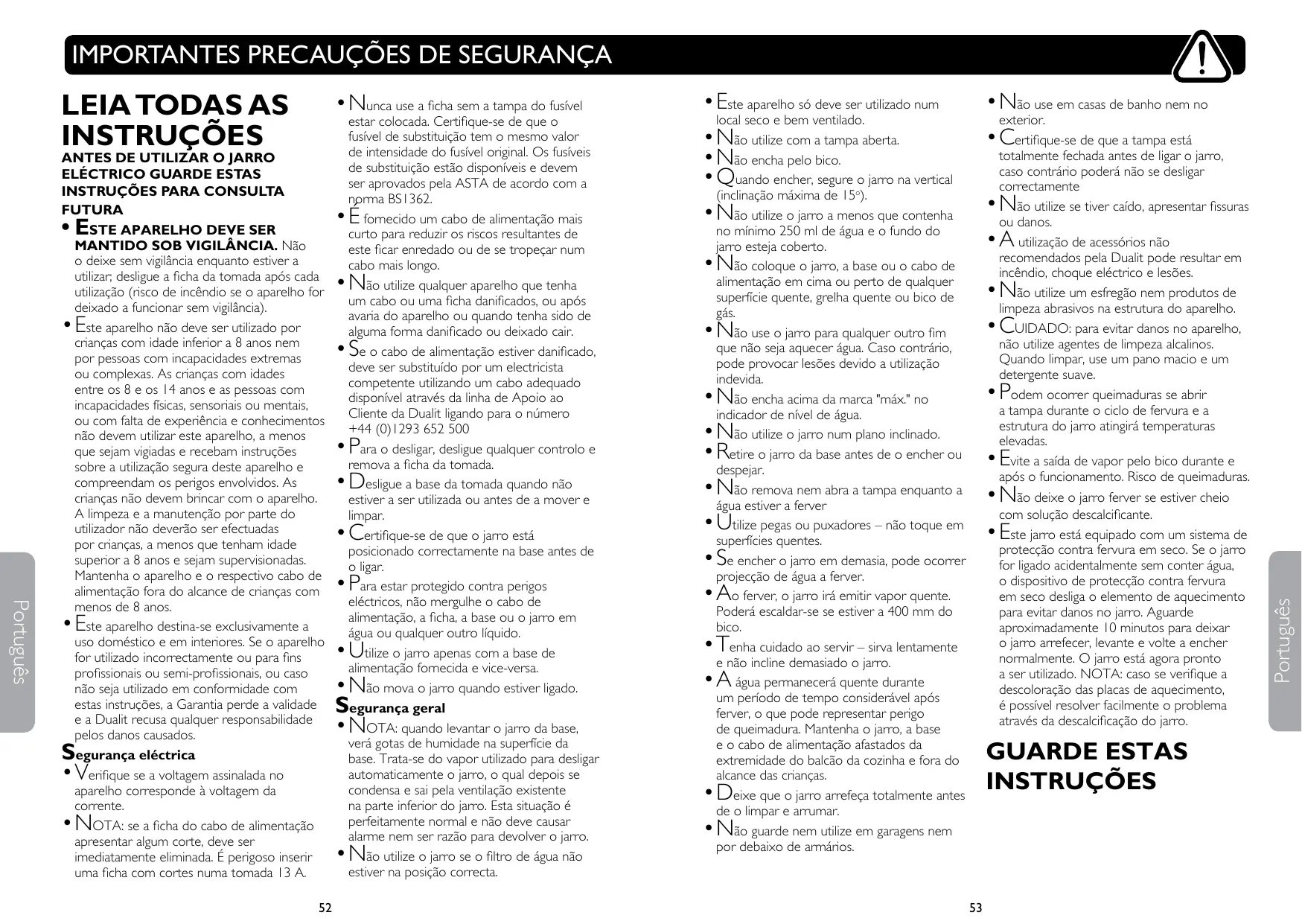 estar colocada. Certifique-se de que o fusível de substituição tem o mesmo valor de intensidade do fusível original. Os fusíveis de substituição estão disponíveis e devem ser aprovados pela ASTA de acordo com a norma BS1362. fornecido um cabo de alimentação mais curto para reduzir os riscos resultantes de este ficar enredado ou de se tropeçar num cabo mais longo. ão utilize qualquer aparelho que tenha um cabo ou uma ficha danificados, ou após avaria do aparelho ou quando tenha sido de alguma forma danificado ou deixado cair. e o cabo de alimentação estiver danificado, deve ser substituído por um electricista competente utilizando um cabo adequado disponível através da linha de Apoio ao Cliente da Dualit ligando para o número +44 (0)1293 652 500 ara o desligar, desligue qualquer controlo e remova a ficha da tomada. esligue a base da tomada quando não estiver a ser utilizada ou antes de a mover e limpar. ertifique-se de que o jarro está posicionado correctamente na base antes de o ligar. ara estar protegido contra perigos eléctricos, não mergulhe o cabo de alimentação, a ficha, a base ou o jarro em água ou qualquer outro líquido. tilize o jarro apenas com a base de alimentação fornecida e vice-versa. ão mova o jarro quando estiver ligado. egurança geral OTA: quando levantar o jarro da base, verá gotas de humidade na superfície da base. Trata-se do vapor utilizado para desligar automaticamente o jarro, o qual depois se condensa e sai pela ventilação existente na parte inferior do jarro. Esta situação é perfeitamente normal e não deve causar alarme nem ser razão para devolver o jarro. ão utilize o jarro se o filtro de água não estiver na posição correcta.