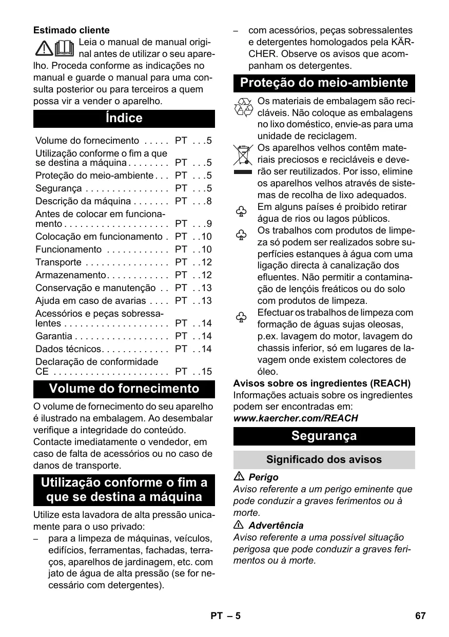 - PT Volume do fornecimento O volume de fornecimento do seu aparelho é ilustrado na embalagem. Ao desembalar verifique a integridade do conteúdo. Contacte imediatamente o vendedor, em caso de falta de acessórios ou no caso de danos de transporte. Utilização conforme o fim a que se destina a máquina Utilize esta lavadora de alta pressão unicamente para o uso privado: – para a limpeza de máquinas, veículos, edifícios, ferramentas, fachadas, terraços, aparelhos de jardinagem, etc. com jato de água de alta pressão (se for necessário com detergentes). com acessórios, peças sobressalentes e detergentes homologados pela KÄRCHER. Observe os avisos que acompanham os detergentes. p. 15