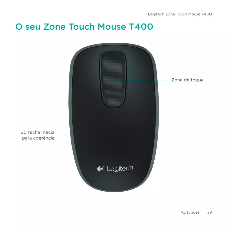 Español Logitech Zone Touch Mouse T400 O seu Zone Touch Mouse T400 Zona de toque Borracha macia para aderência Português