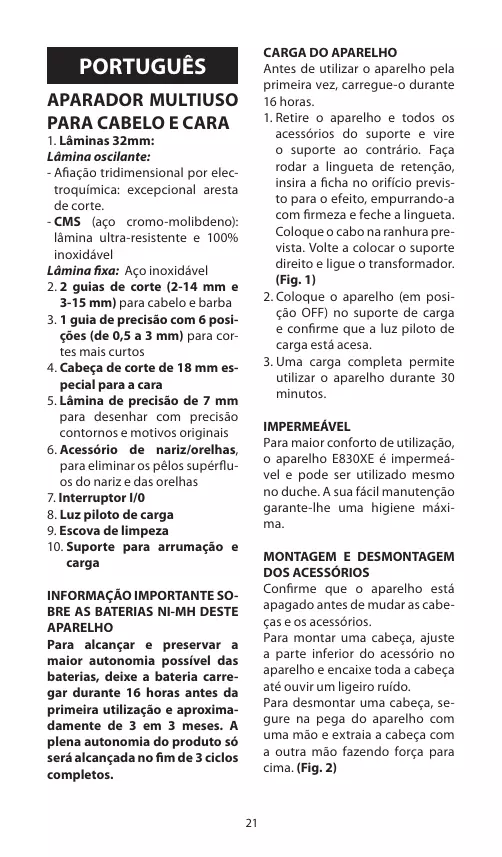 Confirme que o aparelho está apagado antes de mudar as cabeças e os acessórios. Para montar uma cabeça, ajuste a parte inferior do acessório no aparelho e encaixe toda a cabeça até ouvir um ligeiro ruído. Para desmontar uma cabeça, segure na pega do aparelho com uma mão e extraia a cabeça com a outra mão fazendo força para cima. (Fig. 2) INFORMAÇÃO IMPORTANTE SOBRE AS BATERIAS NI-MH DESTE APARELHO Para alcançar e preservar a maior autonomia possível das baterias, deixe a bateria carregar durante 16 horas antes da primeira utilização e aproximadamente de 3 em 3 meses. A plena autonomia do produto só será alcançada no fim de 3 ciclos completos.
