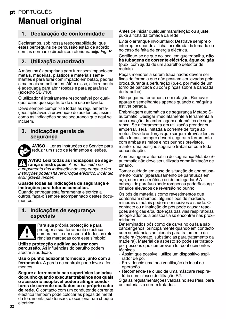 Fig. O. Sous réserve de modifications allant dans le sens du progrès technique. P1 = Filet de la broche de perçage H = Broche à six pans creux m = Poids D * Les perturbations à fréquence et à énergie élevées peuvent occasionner des variations de vitesse. Ces variations cessent dès la disparition des perturbations. Valeurs d'émission Ces valeurs permettent l'estimation des émissions de l'outil électrique et la comparaison entre différents outils électriques. Selon les conditions d'utilisation, l'état de l'outil électrique ou les accessoires utilisés, la sollicitation réelle peut varier plus ou moins. Pour l'estimation, tenir compte des pauses de travail et des phases de sollicitation moindre. Définir des mesures de protection pour l'utilisateur sur la base des valeurs estimatives adaptées en conséquence, p. ex. mesures organisationnelles. Valeurs totales de vibration (somme vectorielle triaxiale) déterminées selon EN 60745 : ah, ID = Valeur d’émission de vibration (perçage avec percussion dans le béton) ah, D = Valeur d’émission de vibrations (perçage dans le métal) Kh,ID,Kh,D=Incertitude (vibration) Niveau sonore typique pondéré A : LpA = niveau de pression acoustique Las piezas de trabajo pequeñas deben asegurarse de manera que la broca no las arrastre consigo al taladrar (p. ej. sujetándolas en el tornillo de banco o fijándolas en la mesa de trabajo con mordazas de rosca). ¡No toque la herramienta en rotación! La máquina debe estar siempre en reposo para eliminar virutas y otros residuos similares. Acoplamiento de seguridad S-automatic de Metabo. Si se activa el acoplamiento de seguridad, desconecte inmediatamente la máquina. Si se atasca o se engancha la herramienta de inserción, se reduce el flujo de potencia al motor. A causa de las grandes fuerzas que se liberan, se deberá sujetar siempre la máquina con ambas manos por sus empuñaduras. Igualmente se debe adoptar una posición adecuada de seguridad y trabajar sin distraerse. El acoplamiento de seguridad Metabo S-automático no debe ser usado como limitador de par de giro. ¡Atención en caso de atornillados difíciles! (enroscar tornillos con rosca métrica o con rosca inglesa en acero) Puede arrancarse la cabeza del tornillo o pueden producirse altos pares de retroceso en la empuñadura. El polvo procedente de algunos materiales, como la pintura con plomo o algunos tipos de madera, minerales y metales, puede ser perjudicial para la salud. El contacto o la inhalación del polvo puede causar reacciones alérgicas y/o enfermedades respiratorias al usuario o a las personas próximas a él. Algunas maderas, como la de roble o haya, producen un polvo que podría ser cancerígeno, especialmente en combinación con aditivos para el tratamiento de maderas (cromato, conservantes para madera). El material con contenido de amianto solo debe ser manipulado por personal especializado. - Si es posible, utilice algún sistema de aspiración de polvo. - Ventile su lugar de trabajo. - Se recomienda utilizar una máscara de protección contra el polvo con clase de filtro P2. Observe la normativa vigente en su país respecto al material que se va a manipular.