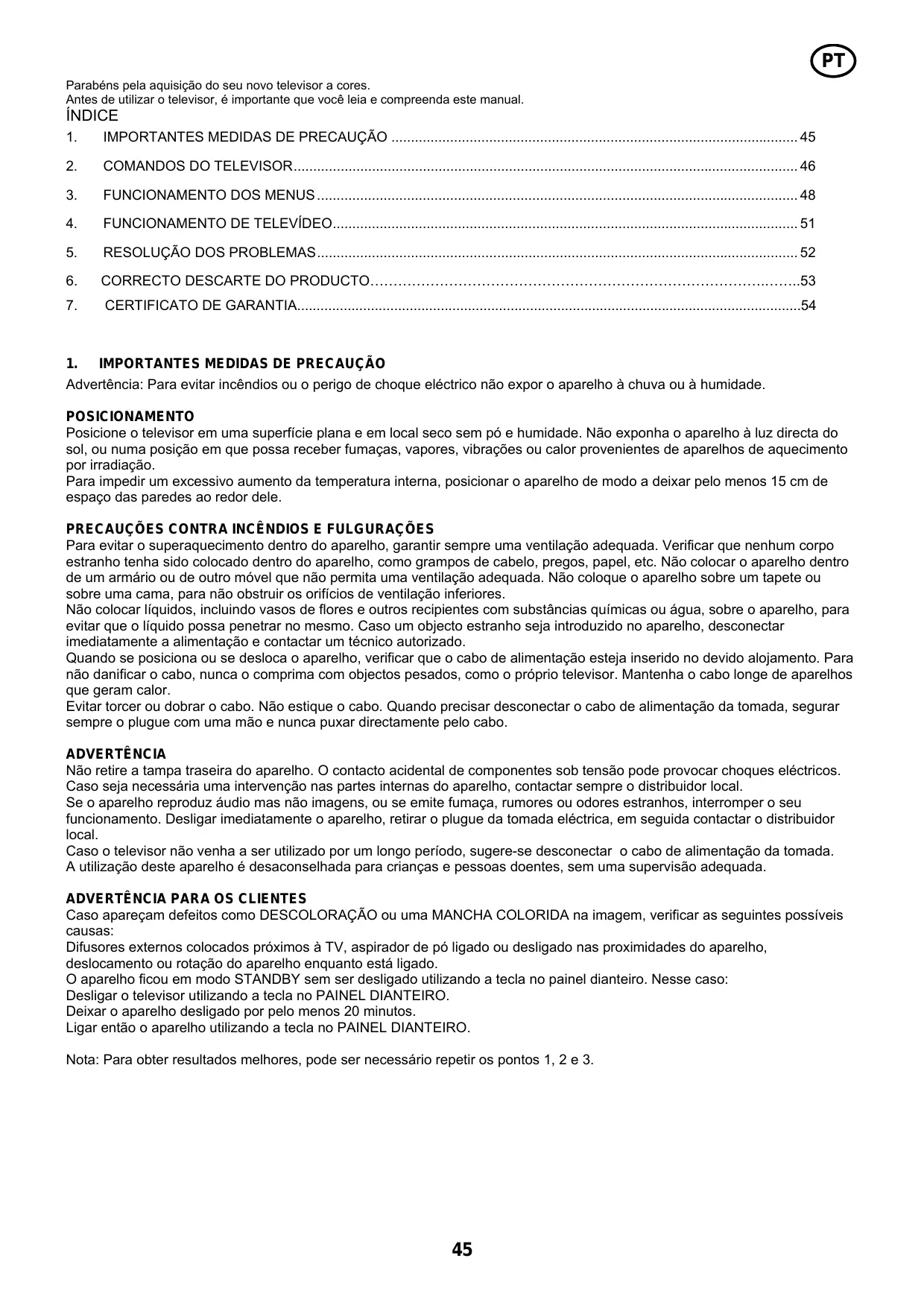 Advertência: Para evitar incêndios ou o perigo de choque eléctrico não expor o aparelho à chuva ou à humidade. POSICIONAMENTO Posicione o televisor em uma superfície plana e em local seco sem pó e humidade. Não exponha o aparelho à luz directa do sol, ou numa posição em que possa receber fumaças, vapores, vibrações ou calor provenientes de aparelhos de aquecimento por irradiação. Para impedir um excessivo aumento da temperatura interna, posicionar o aparelho de modo a deixar pelo menos 15 cm de espaço das paredes ao redor dele. PRECAUÇÕES CONTRA INCÊNDIOS E FULGURAÇÕES Para evitar o superaquecimento dentro do aparelho, garantir sempre uma ventilação adequada. Verificar que nenhum corpo estranho tenha sido colocado dentro do aparelho, como grampos de cabelo, pregos, papel, etc. Não colocar o aparelho dentro de um armário ou de outro móvel que não permita uma ventilação adequada. Não coloque o aparelho sobre um tapete ou sobre uma cama, para não obstruir os orifícios de ventilação inferiores. Não colocar líquidos, incluindo vasos de flores e outros recipientes com substâncias químicas ou água, sobre o aparelho, para evitar que o líquido possa penetrar no mesmo. Caso um objecto estranho seja introduzido no aparelho, desconectar imediatamente a alimentação e contactar um técnico autorizado. Quando se posiciona ou se desloca o aparelho, verificar que o cabo de alimentação esteja inserido no devido alojamento. Para não danificar o cabo, nunca o comprima com objectos pesados, como o próprio televisor. Mantenha o cabo longe de aparelhos que geram calor. Evitar torcer ou dobrar o cabo. Não estique o cabo. Quando precisar desconectar o cabo de alimentação da tomada, segurar sempre o plugue com uma mão e nunca puxar directamente pelo cabo. ADVERTÊNCIA Não retire a tampa traseira do aparelho. O contacto acidental de componentes sob tensão pode provocar choques eléctricos. Caso seja necessária uma intervenção nas partes internas do aparelho, contactar sempre o distribuidor local. Se o aparelho reproduz áudio mas não imagens, ou se emite fumaça, rumores ou odores estranhos, interromper o seu funcionamento. Desligar imediatamente o aparelho, retirar o plugue da tomada eléctrica, em seguida contactar o distribuidor local. Caso o televisor não venha a ser utilizado por um longo período, sugere-se desconectar o cabo de alimentação da tomada. A utilização deste aparelho é desaconselhada para crianças e pessoas doentes, sem uma supervisão adequada.