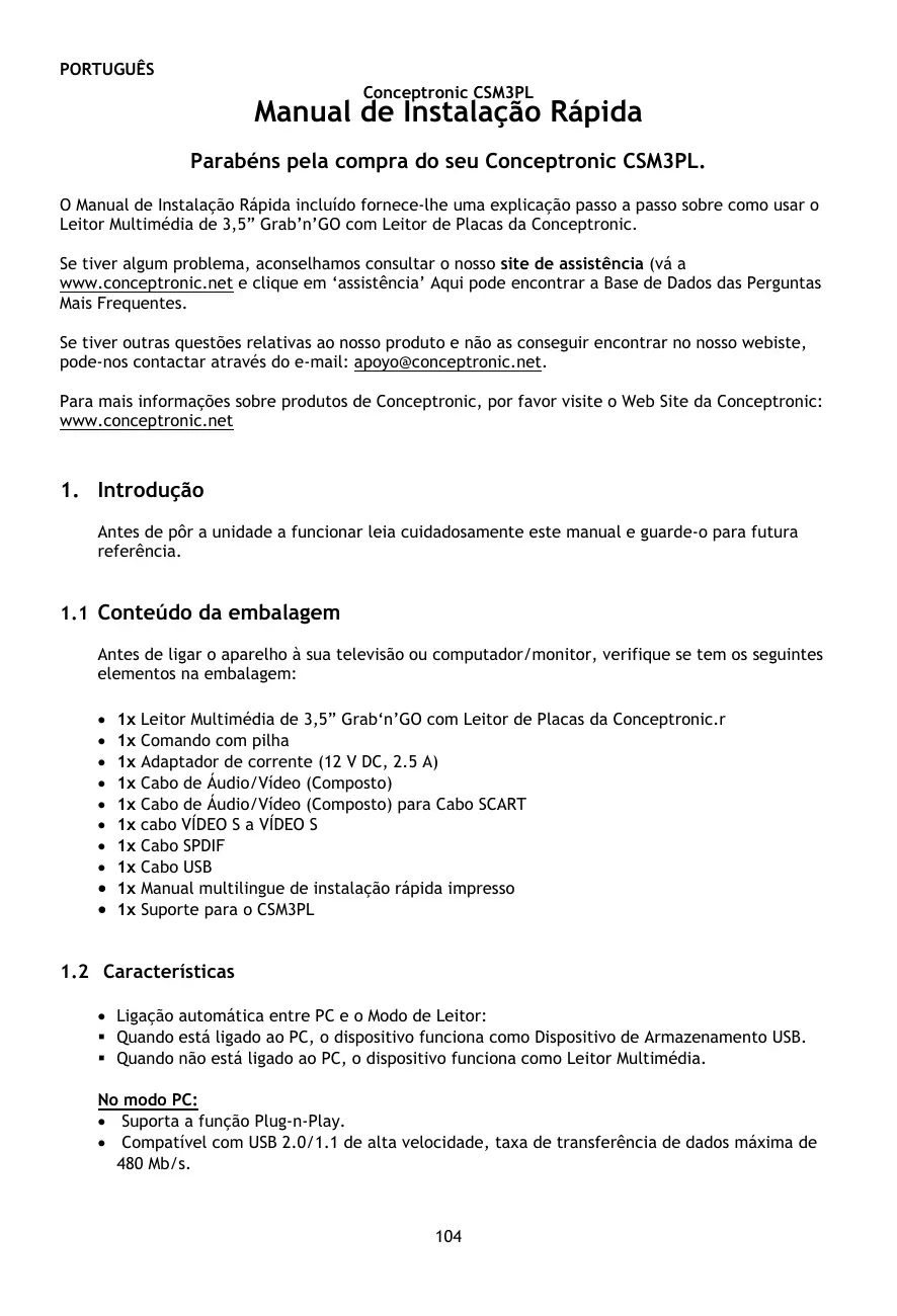 Baixe as instruções para o seu Leitor multimédia em formato PDF gratuitamente! Encontre o seu manual CSM3PL - CONCEPTRONIC e retome o controlo do seu dispositivo eletrónico. Nesta página estão publicados todos os documentos necessários para a utilização do seu dispositivo. CSM3PL da marca CONCEPTRONIC.