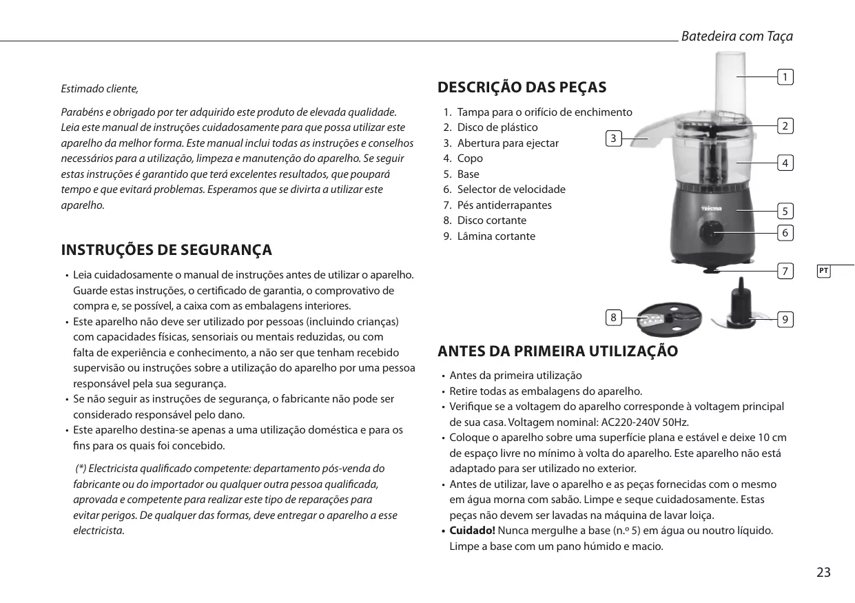 Batedeira com Taça Estimado cliente, Parabéns e obrigado por ter adquirido este produto de elevada qualidade. Leia este manual de instruções cuidadosamente para que possa utilizar este aparelho da melhor forma. Este manual inclui todas as instruções e conselhos necessários para a utilização, limpeza e manutenção do aparelho. Se seguir estas instruções é garantido que terá excelentes resultados, que poupará tempo e que evitará problemas. Esperamos que se divirta a utilizar este aparelho. Instruções de Segurança