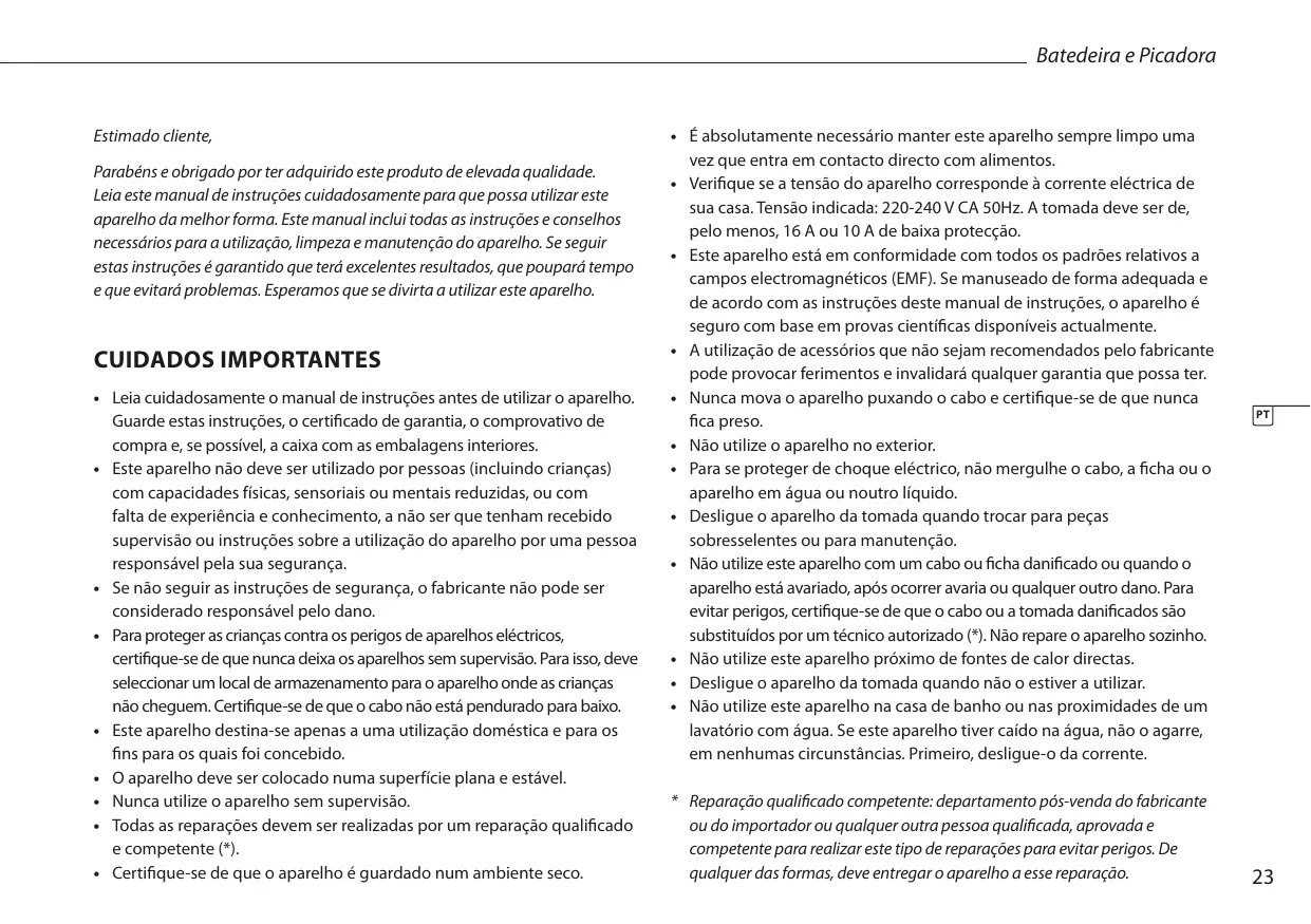- Este aparelho está em conformidade com todos os padrões relativos a campos electromagnéticos (EMF). Se manuseado de forma adequada e de acordo com as instruções deste manual de instruções, o aparelho é seguro com base em provas científicas disponíveis actualmente.