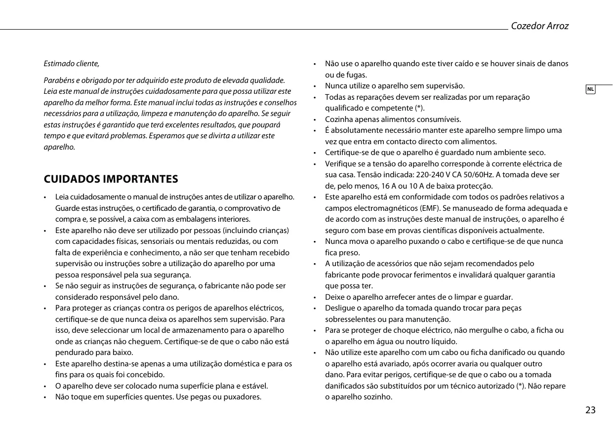 Parabéns e obrigoado por ter adquirido este produit de elevada calidad. Leia este manual de instruções cuidadosamente para que possa usar este aparelho da melhor forma. Este manual inclui todas as instruções e conselho necessários para a utilização, limpeza e manutenção do aparelho. Se seguir estas instruções é garantindo que terá excelentes resultados, que poupará tempo e que evitará problemas. Esperamos que se divirta a utiliser este aparelho.