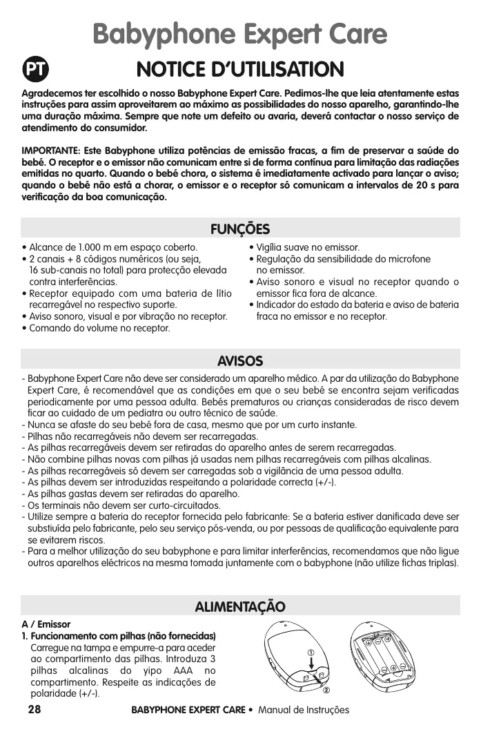AVISOS - Babyphone Expert Care não deve ser considerado um aparelho médico. A par da utilização do Babyphone Expert Care, é recomendável que as condições em que o seu bebé se encontra sejam verificadas periodicamente por uma pessoa adulta. Bebés prematuros ou crianças consideradas de risco devem ficar ao cuidado de um pediatra ou outro técnico de saúde. - Nunca se afaste do seu bebé fora de casa, mesmo que por um curto instante. - Pilhas não recarregáveis não devem ser recarregadas. - As pilhas recarregáveis devem ser retiradas do aparelho antes de serem recarregadas. - Não combine pilhas novas com pilhas já usadas nem pilhas recarregáveis com pilhas alcalinas. - As pilhas recarregáveis só devem ser carregadas sob a vigilância de uma pessoa adulta. - As pilhas devem ser introduzidas respeitando a polaridade correcta (+/-). - As pilhas gastas devem ser retiradas do aparelho. - Os terminais não devem ser curto-circuitados. - Utilize sempre a bateria do receptor fornecida pelo fabricante: Se a bateria estiver danificada deve ser substiuída pelo fabricante, pelo seu serviço pós-venda, ou por pessoas de qualificação equivalente para se evitarem riscos. - Para a melhor utilização do seu babyphone e para limitar interferências, recomendamos que não ligue outros aparelhos eléctricos na mesma tomada juntamente com o babyphone (não utilize fichas triplas).