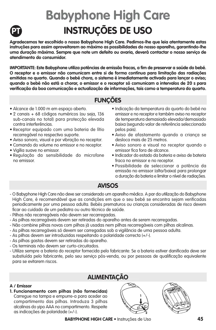 AVISOS - O Babyphone High Care não deve ser considerado um aparelho médico. A par da utilização do Babyphone High Care, é recomendável que as condições em que o seu bebé se encontra sejam verificadas periodicamente por uma pessoa adulta. Bebés prematuros ou crianças consideradas de risco devem ficar ao cuidado de um pediatra ou outro técnico de saúde. - Pilhas não recarregáveis não devem ser recarregadas. - As pilhas recarregáveis devem ser retiradas do aparelho antes de serem recarregadas. - Não combine pilhas novas com pilhas já usadas nem pilhas recarregáveis com pilhas alcalinas. - As pilhas recarregáveis só devem ser carregadas sob a vigilância de uma pessoa adulta. - As pilhas devem ser introduzidas respeitando a polaridade correcta (+/-). - As pilhas gastas devem ser retiradas do aparelho. - Os terminais não devem ser curto-circuitados. - Utilize sempre a bateria do receptor fornecida pelo fabricante: Se a bateria estiver danificada deve ser substiuída pelo fabricante, pelo seu serviço pós-venda, ou por pessoas de qualificação equivalente para se evitarem riscos.