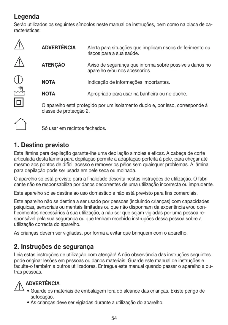 1. Destino previsto Esta lâmina para depilação garante-lhe uma depilação simples e eficaz. A cabeça de corte articulada desta lâmina para depilação permite a adaptação perfeita à pele, para chegar até mesmo aos pontos de difícil acesso e remover os pêlos sem quaisquer problemas. A lâmina para depilação pode ser usada em pele seca ou molhada. O aparelho só está previsto para a finalidade descrita nestas instruções de utilização. O fabricante não se responsabiliza por danos decorrentes de uma utilização incorrecta ou imprudente. Este aparelho só se destina ao uso doméstico e não está previsto para fins comerciais. Este aparelho não se destina a ser usado por pessoas (incluindo crianças) com capacidades psíquicas, sensoriais ou mentais limitadas ou que não disponham da experiência e/ou conhecimentos necessários à sua utilização, a não ser que sejam vigiadas por uma pessoa responsável pela sua segurança ou que tenham recebido instruções dessa pessoa sobre a utilização correcta do aparelho. As crianças devem ser vigiladas, por forma a evitar que brinquem com o aparelho.