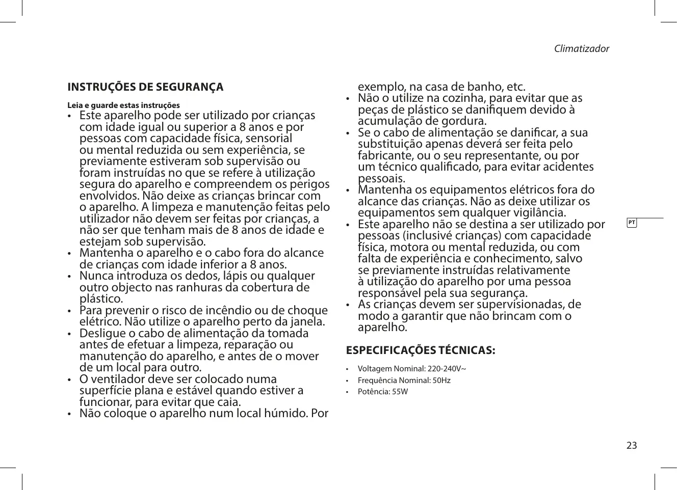 - Este aparelho pode ser utilizado por crianças com idade igual ou superior a 8 anos e por pessoas com capacidade física, sensorial ou mental reduzida ou sem experiência, se previamente estiveram sob supervisão ou foram instruídas no que se refere à utilização segura do aparelho e compreendem os perigos envolvidos. Não deixe as crianças brincar com o aparelho. A limpeza e manutenção feitas pelo utilizador não devem ser feitas por crianças, a não ser que tenham mais de 8 anos de idade e estejam sob supervisão.