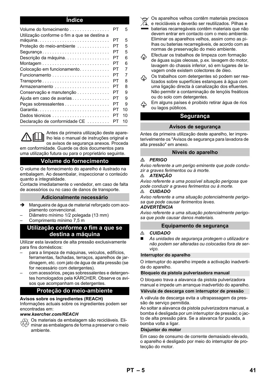 Avisos sobre os ingredientes (REACH) Informações actuais sobre os ingredientes podem ser encontradas em: www.kaercher.com/REACH Os materiais da embalagem são recicláveis. Eliminar as embalagens de forma a preservar o meio ambiente.