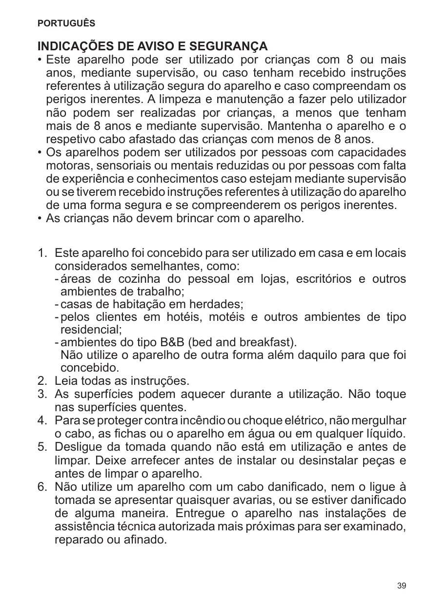 considerados semelhantes, como: - áreas de cozinha do pessoal em lojas, escritórios e outros ambientes de trabalho; - casas de habitação em herdades; - pelos clientes em hotéis, motéis e outros ambientes de tipo residencial; - ambientes do tipo B&B (bed and breakfast). Não utilize o aparelho de outra forma além daquilo para que foi concebido. . Leia todas as instruções. . As superfícies podem aquecer durante a utilização. Não toque nas superfícies quentes. . Para se proteger contra incêndio ou choque elétrico, não mergulhar o cabo, as fichas ou o aparelho em água ou em qualquer líquido. . Desligue da tomada quando não está em utilização e antes de limpar. Deixe arrefecer antes de instalar ou desinstalar peças e antes de limpar o aparelho. . Não utilize um aparelho com um cabo danificado, nem o ligue à tomada se apresentar quaisquer avarias, ou se estiver danificado de alguma maneira. Entregue o aparelho nas instalações de assistência técnica autorizada mais próximas para ser examinado, reparado ou afinado.