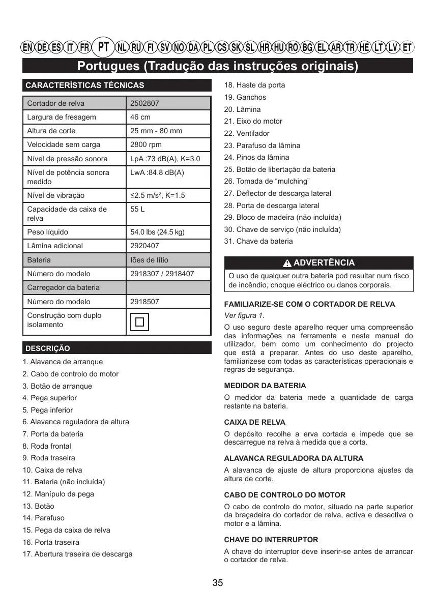 PT NL RU FI SV NO DA PL CS SK SL HR HU RO BG EL AR TR HE Portugues (Tradução das instruções originais)
