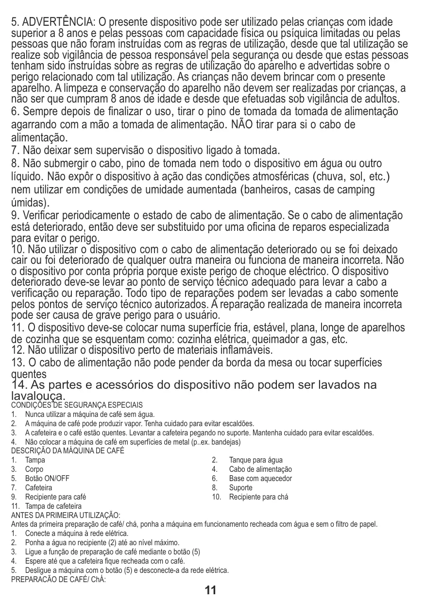 ADVERTÉNCIA: O presente dispositivo pode ser utilizesdo pelas crianças comidade superior a 8 anos e pelas pessoas com capacidade fisica ou psíquica limitadas ou pelas pessoas que não foram instruções com as regras de utilização, desde que talutilização se realize sob vigilência de pessoas responsavelPGA segança ou desde que estas pessoas tenham sido instruções sobre as regras de utilityação do aparelho e advertidas sobre o perigo relacionado com talutilização. As crianças não devem brincar com o presente aparelho. A limpeza e conservação do aparho não devem ser realizadas por crianças, a não ser que cumpram 8 anos de idade e desde que efetuadas sob vigilência de adultos.