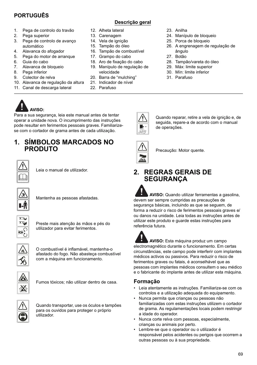 20. Barra de “mulching” 21. Indicador de nível 22. Parafuso