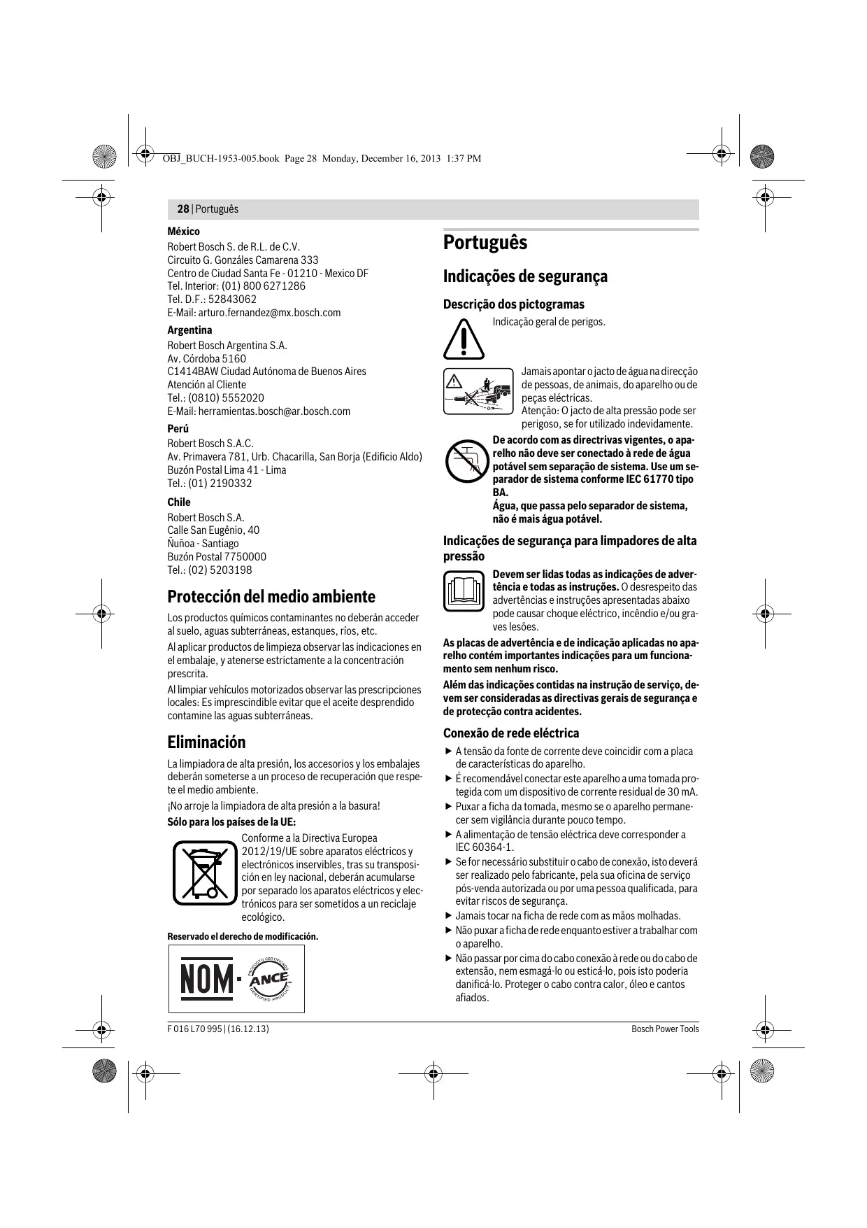 6,65/8,12 7,83/8,82 8,9 /II /II /II Veja número de série (placa de características) no limpador de alta pressão Processos de ligação provocam uma breve redução de tensão. No caso de condições de rede desfavoráveis, o funcionamento de outros aparelhos pode ser prejudicado. Em impedâncias de rede inferiores a 0,153 Ohm não se conta com avarias. F 016 L70 995 | (16.12.13) Bosch Power Tools OBJ_BUCH-1953-005.book Page 31 Monday, December 16, 2013 1:37 PM Português | 31 Informação sobre ruídos/vibrações Valores de medição para ruídos, determinados conforme 2000/14/CE (1,60 m de altura, 1 m de distância). O nível de ruído avaliado A, do aparelho, é tipicamente de: nível de pressão acústica nível de potência acústica incerteza K Usar protecção auricular! Valores totais de vibração (soma de vectores de três direcções) averiguada conforme EN 60335: valores totais de vibração ah incerteza K