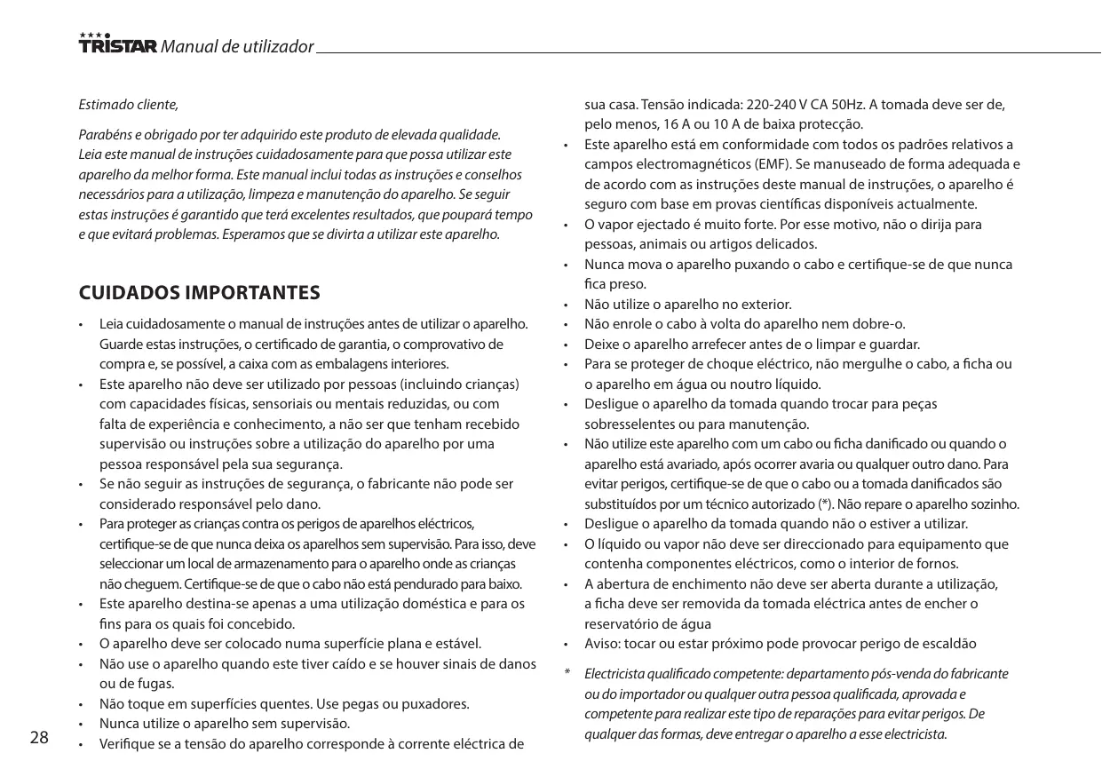 - Danos causados pelo não seguem do manual de instruções anularão a garantia e seippo resultar em danos consequentes, a Tristar não sera responsavel.