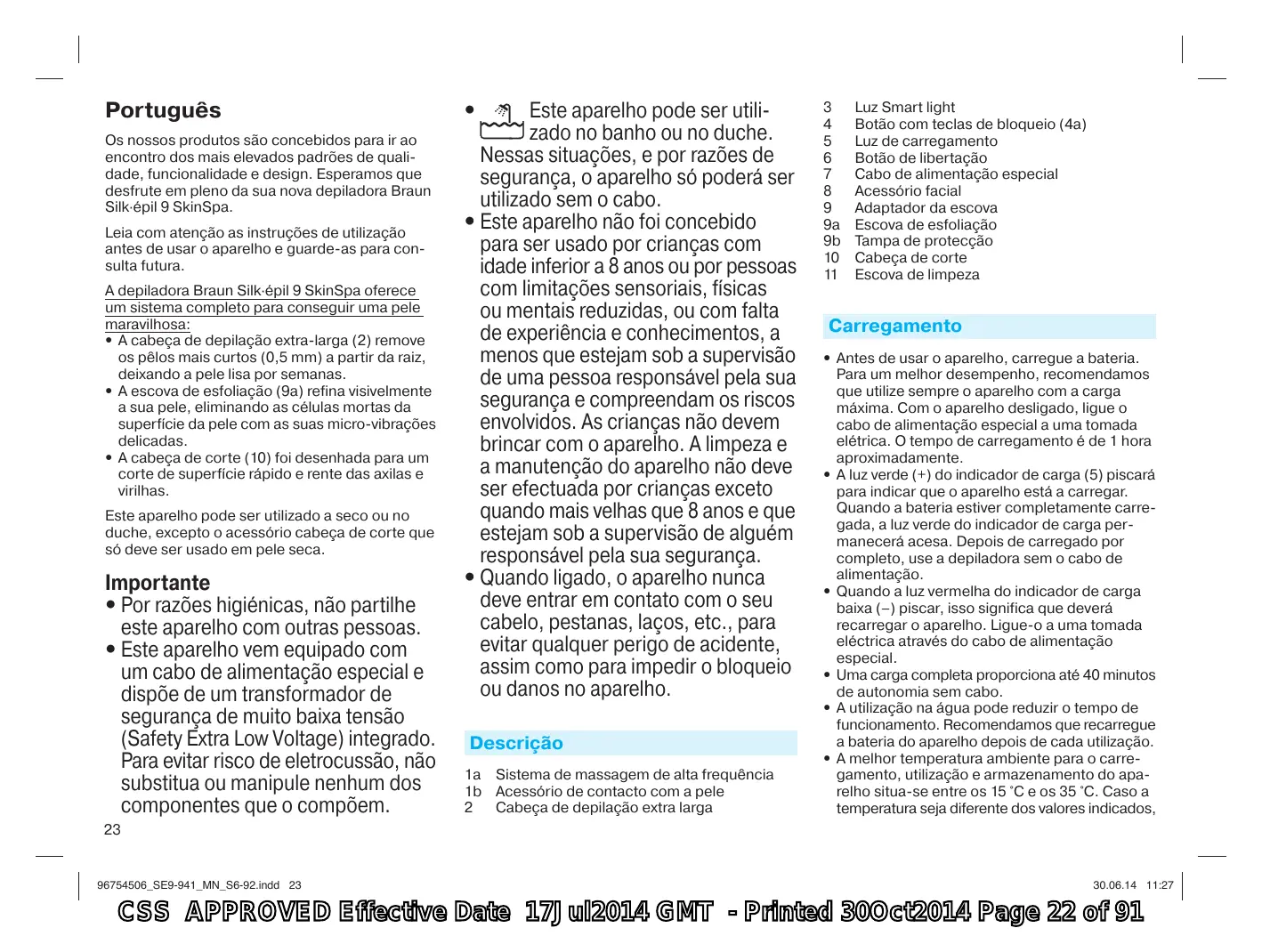 CSS APPROVED Effective Date 17Jul2014 GMT - Printed 30Oct2014 Page 21 of 91 Português Os nossos produtos são concebidos para ir ao encontro dos mais elevados padrões de qualidade, funcionalidade e design. Esperamos que desfrute em pleno da sua nova depiladora Braun Silk·épil 9 SkinSpa. Leia com atenção as instruções de utilização antes de usar o aparelho e guarde-as para consulta futura. A depiladora Braun Silk·épil 9 SkinSpa oferece um sistema completo para conseguir uma pele maravilhosa: