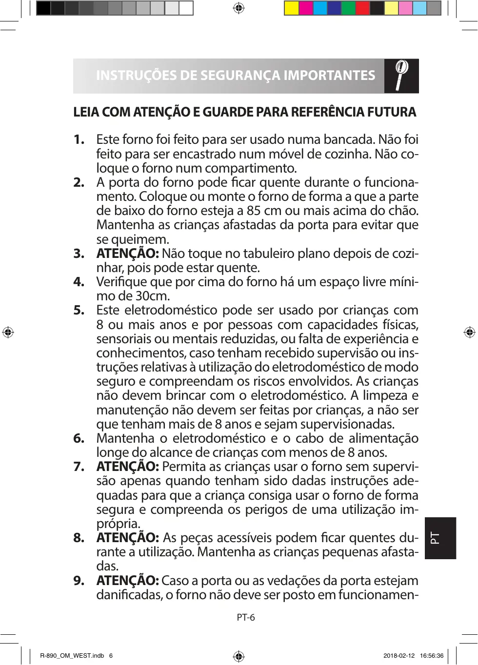 evitar queimaduras use sempre luvas espessas de forno. PT-7 R-890_OM_WEST.indb 7 2018-02-12 16:56:36 Antes de limpar certifique-se de que não estão quentes. Quando aquecer alimentos em recipientes de plástico ou papel, vigie o forno pois pode ocorrer ignição.