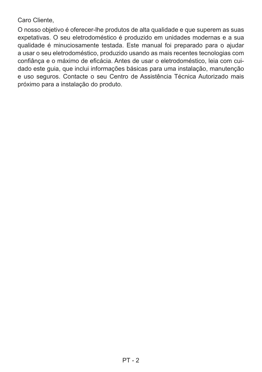 TRANSPORTE Si necesita transportar el producto: conserve la caja original del producto y métalo en ella cuando necesite transportarlo. En ese caso, siga las instrucciones de transporte. Sujete las piezas ES - 17 superiores y las tapas de las ollas y sartenes a los paneles de cocción. Coloque papel entre el protector superior y el panel de cocción, cubra el protector superior y, a continuación, sujételos a las superficies laterales del horno. Coloque cartón o papel en el protector delantero del cristal interior del horno, para que las bandejas y la parrilla no dañen el protector del horno durante el transporte. Sujete también los protectores del horno a las paredes laterales. Si no tiene la caja original: adopte medidas para que las superficies externas (superficies de cristal y pintadas) del horno no se rompan. ES - 18 Caro Cliente, O nosso objetivo é oferecer-lhe produtos de alta qualidade e que superem as suas expetativas. O seu eletrodoméstico é produzido em unidades modernas e a sua qualidade é minuciosamente testada. Este manual foi preparado para o ajudar a usar o seu eletrodoméstico, produzido usando as mais recentes tecnologias com confiânça e o máximo de eficácia. Antes de usar o eletrodoméstico, leia com cuidado este guia, que inclui informações básicas para uma instalação, manutenção e uso seguros. Contacte o seu Centro de Assistência Técnica Autorizado mais próximo para a instalação do produto. PT - 2 Conteúdos Apresentação e tamanho do produto Avisos Preparação para instalar e usar Utilização do forno Limpeza e manutenção do seu produto Assistência técnica e transporte PT - 3