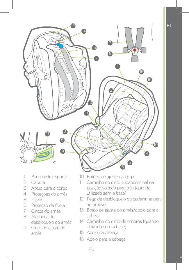 Pega de transporte Capota Apoio para o corpo Proteções do arnês Fivela Proteção da fivela Cintos do arnês Alavanca de desbloqueio do arnês Cinto de ajuste do arnês