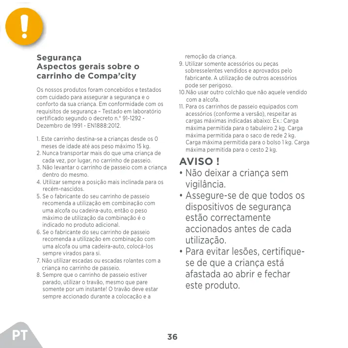 AVISO ! ão deixar a criança sem vigilância. ssegure-se de que todos os dispositivos de segurança estão correctamente accionados antes de cada utilização. ara evitar lesões, certifiquese de que a criança está afastada ao abrir e fechar este produto.