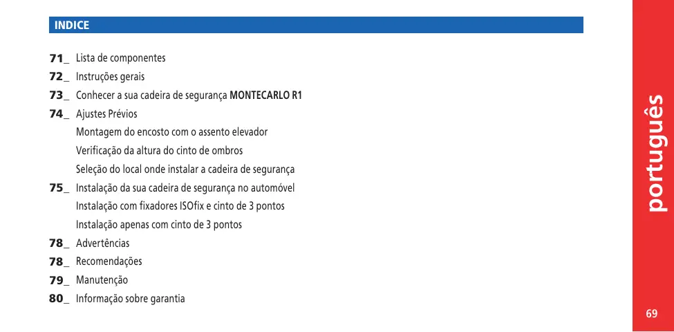 Placez votre MONTECARLO R1 sur le siège du véhicule en suivant les conseils et mises en garde indiquées dans les INSTRUCTIONS GÉNÉRALES.